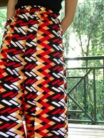 アフリカ布の明るさとユニークな柄たちがアクセントとなり、生活を楽しく明るくしてくれるワイドパンツ。