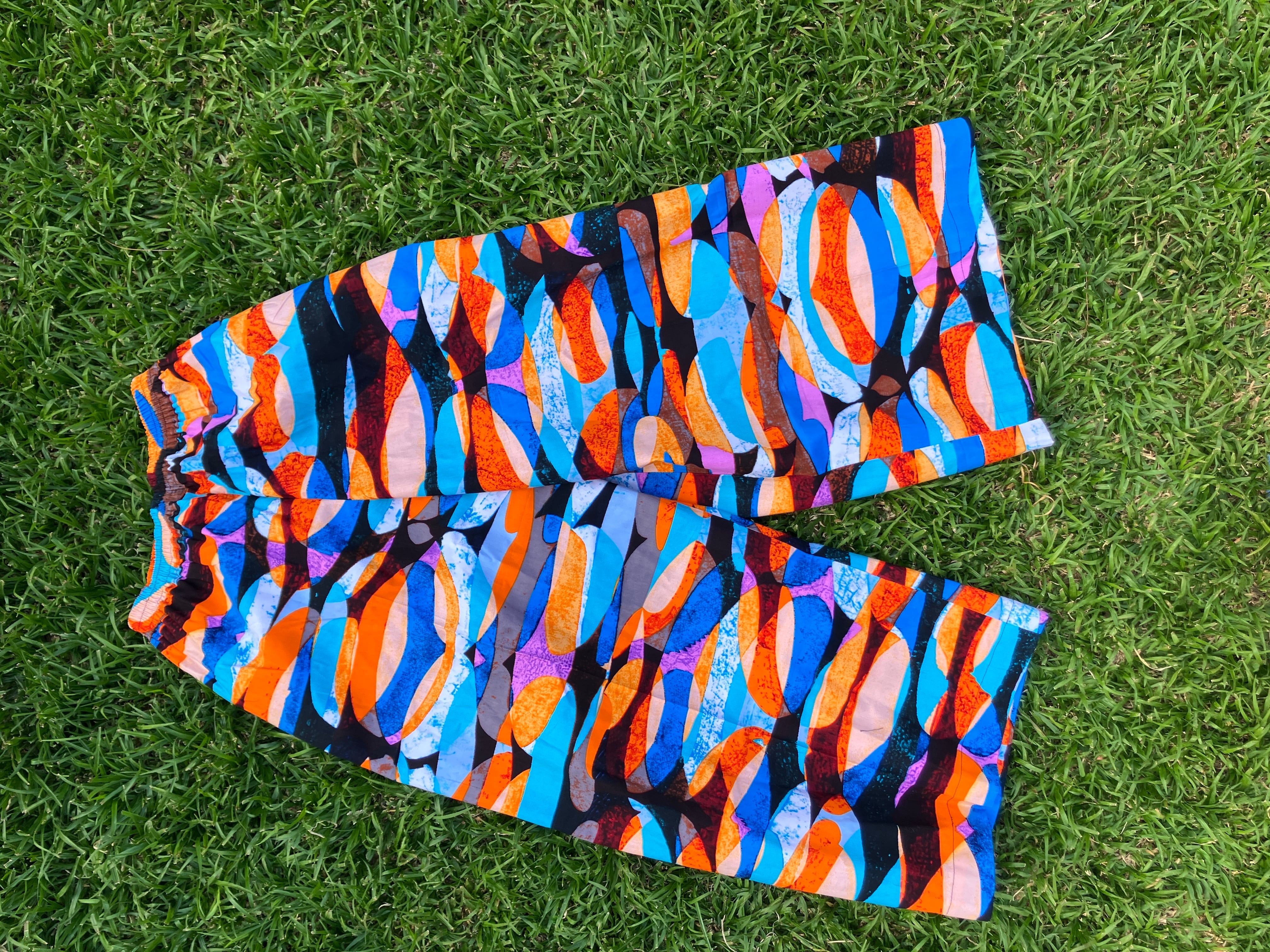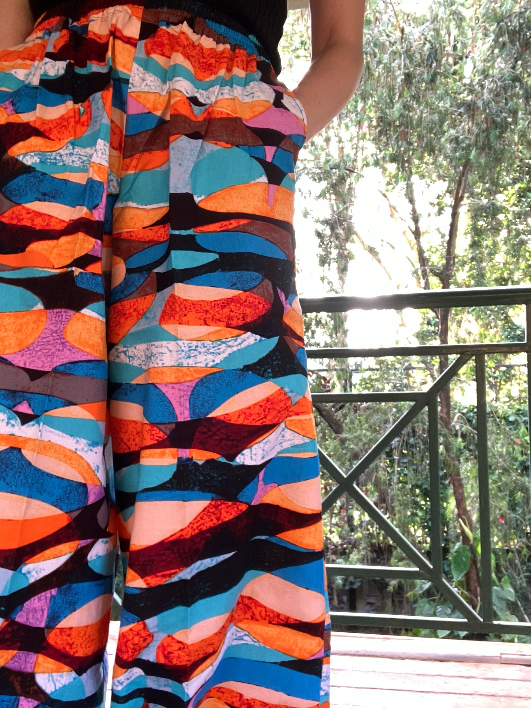 アフリカ布の明るさとユニークな柄たちがアクセントとなり、生活を楽しく明るくしてくれるワイドパンツ。