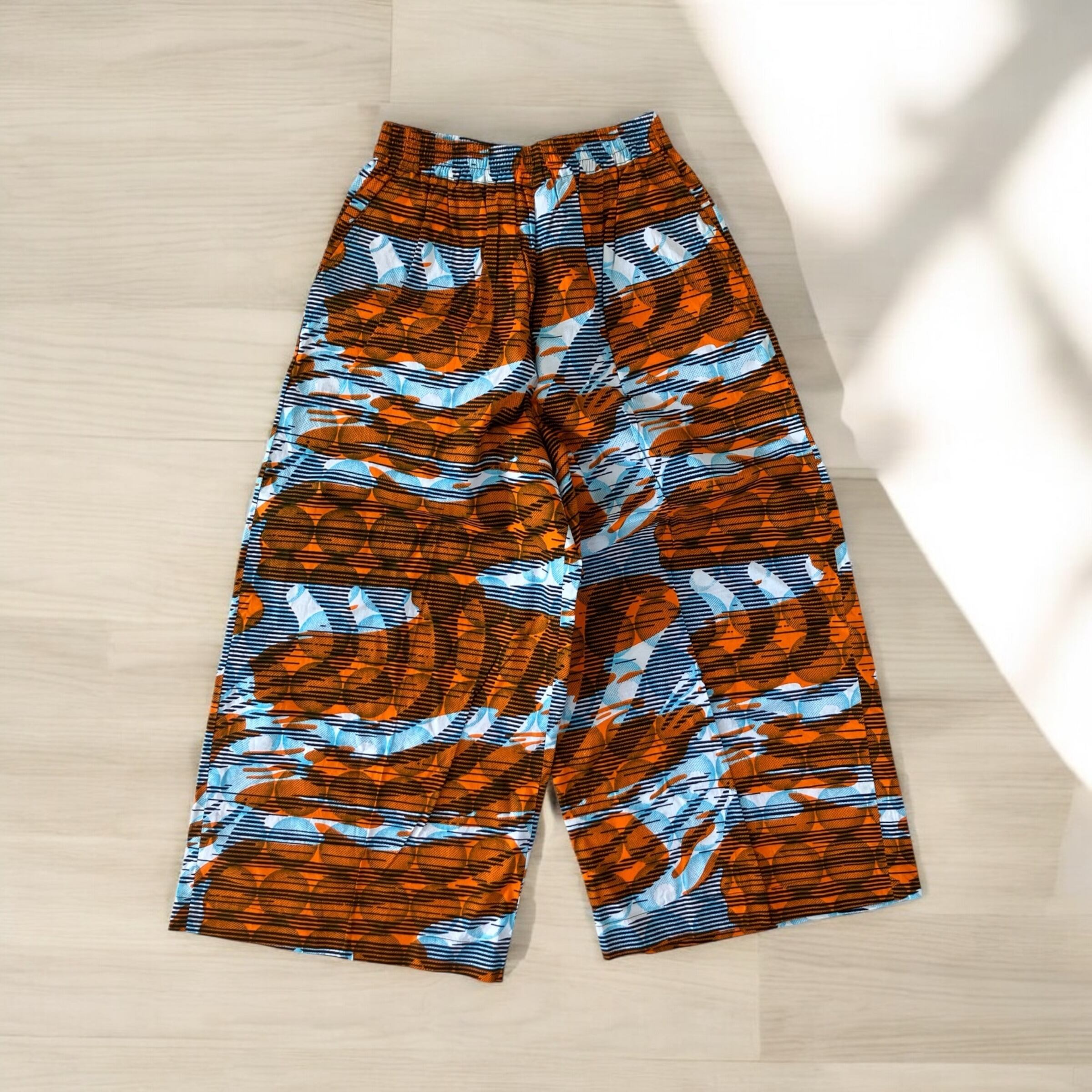 アフリカ布の明るさとユニークな柄たちがアクセントとなり、生活を楽しく明るくしてくれるストレートパンツ