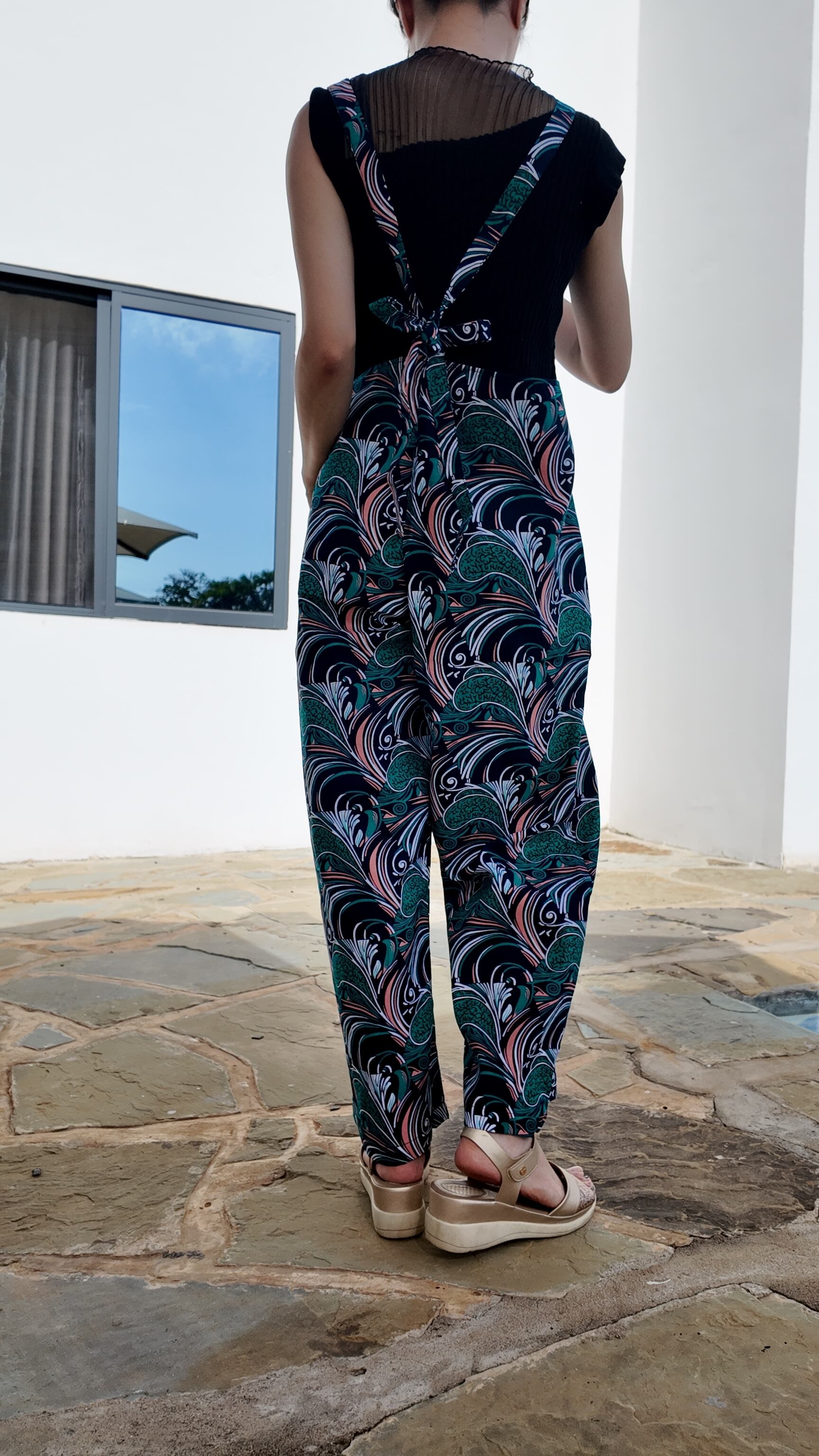 肩の紐を背中に回してリボン結びするだけの、簡単かわいいサロペット!