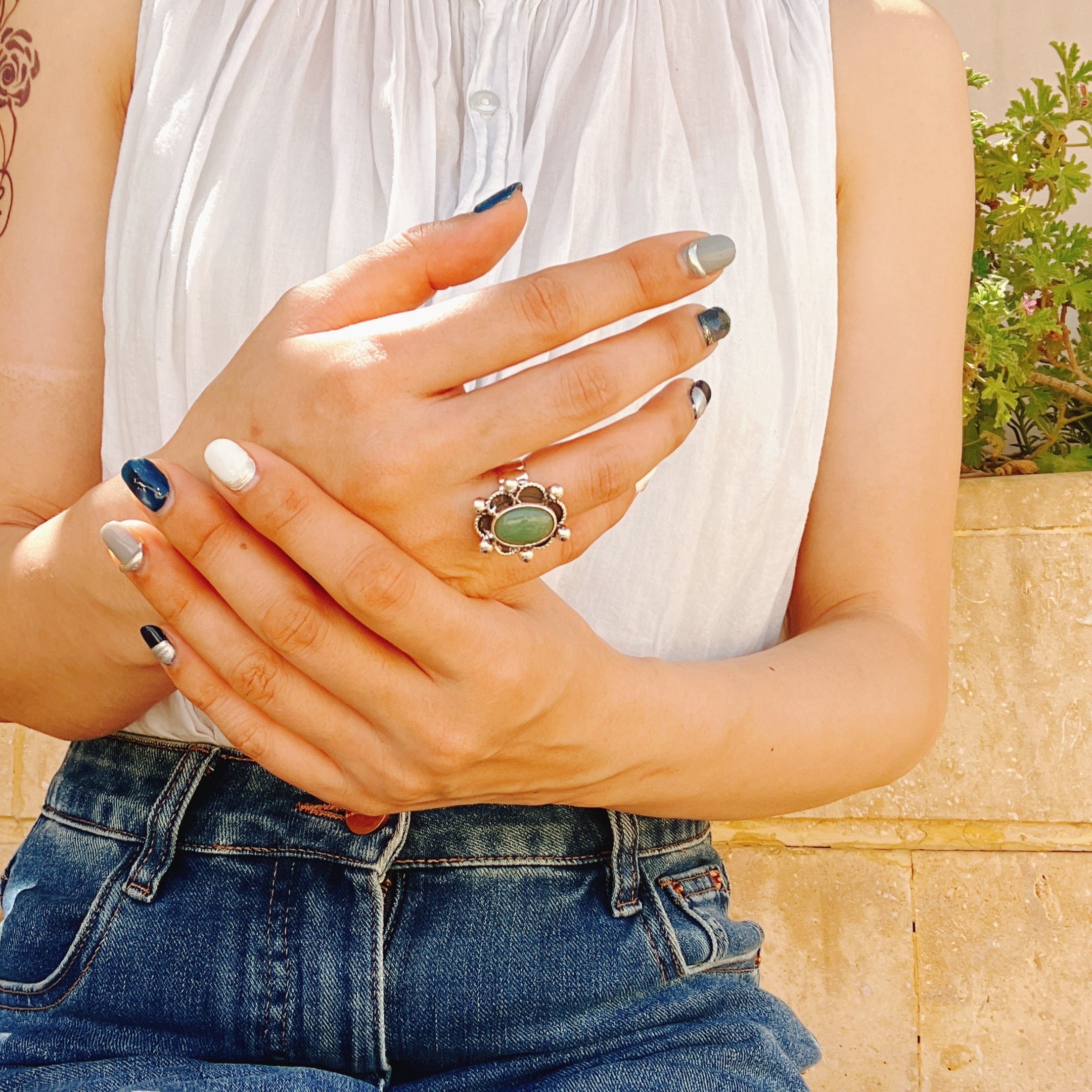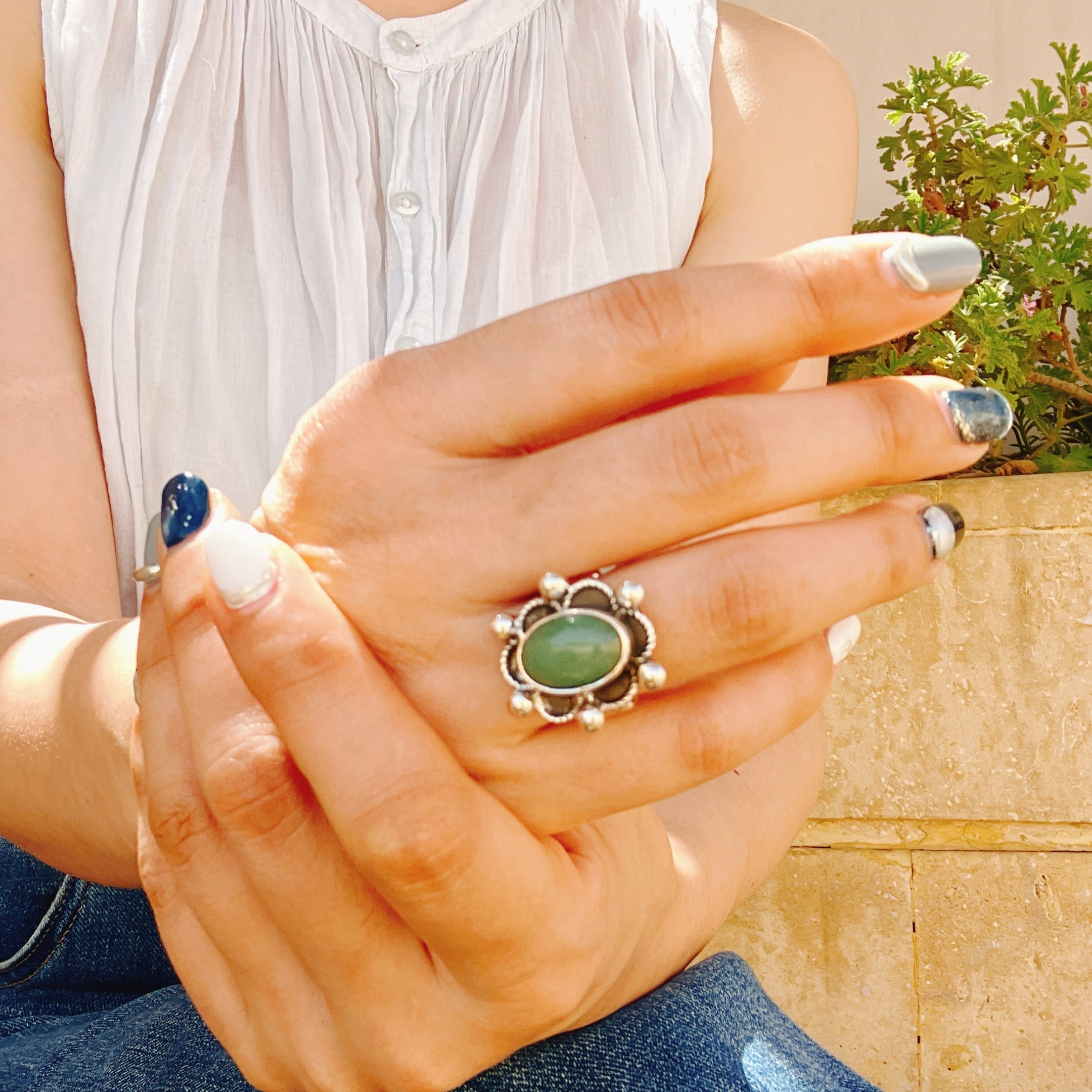 エジプトの老舗シルバーショップからのピュアシルバーリングが登場! シルバー925 原石のようなアフリカンエメラルド。なんとも言えない優しく淡い美しいグリーンが魅力的です。フォーマルな場面でも、カジュアルでも。楽しんでぐんといい女をあげるアクセサリーです。 世界にひとつだけの特別なリング。 アフリカからの多くのエネルギーを感じてください。 サイズ:13 縦2cm 横2cm 石の縦1.5cm 石の横1cm