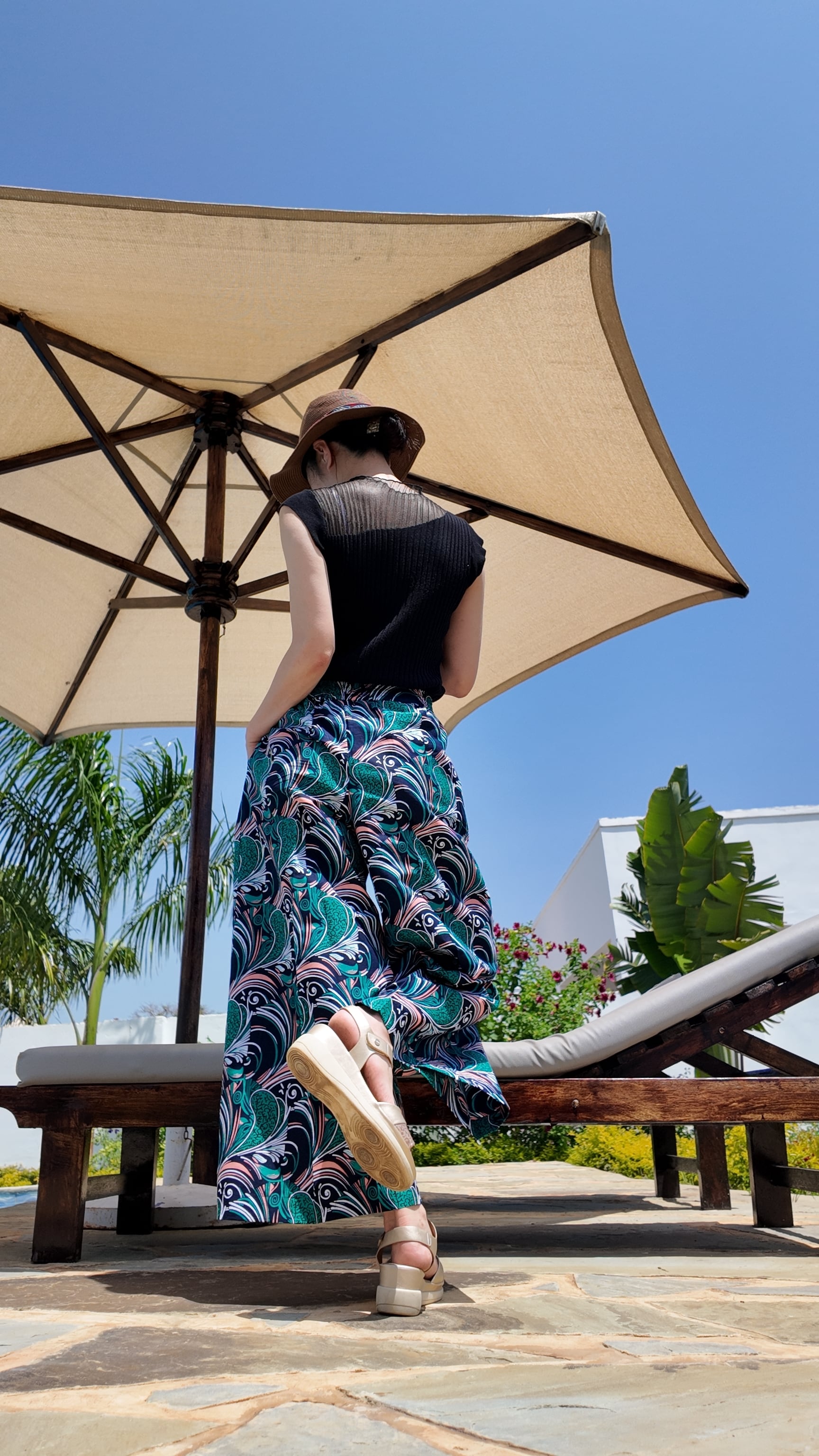 かがんだり、座ったりするのもスムーズ。よく広がる裾です。春から秋まで長くご着用することができます。