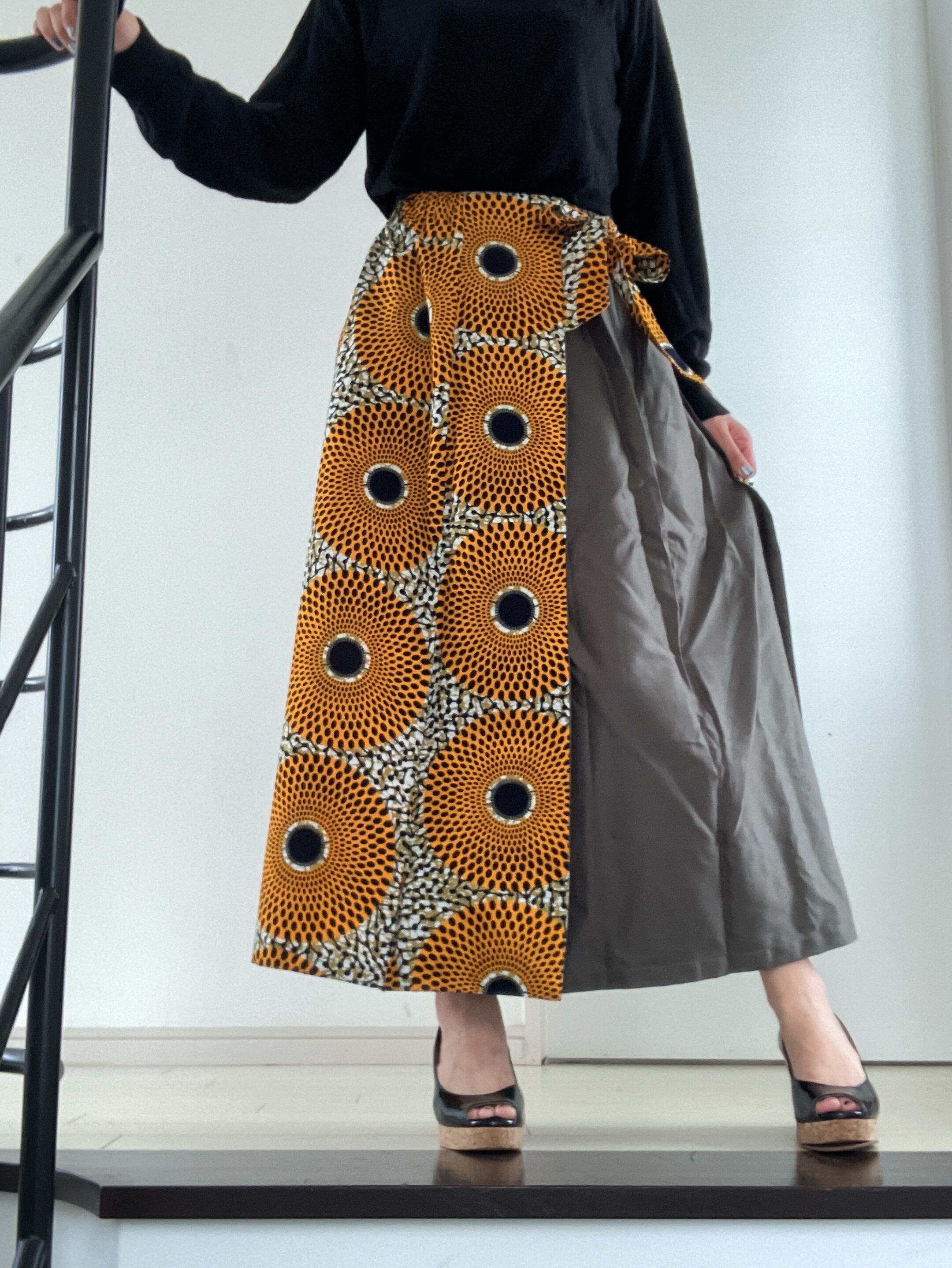 表はシンプルな無地。だけど、歩いたり座ったりするたびに、鮮やかなアフリカ布がちらりと顔をのぞかせます。上品さの中に遊び心が光る、特別な一枚です。