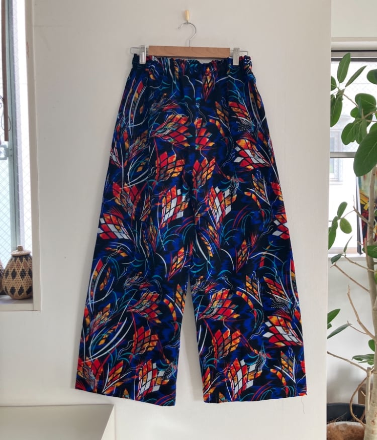 アフリカ布の明るさとユニークな柄たちがアクセントとなり、生活を楽しく明るくしてくれるストレートパンツ