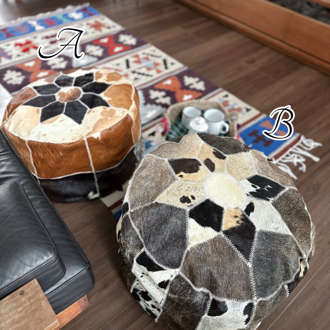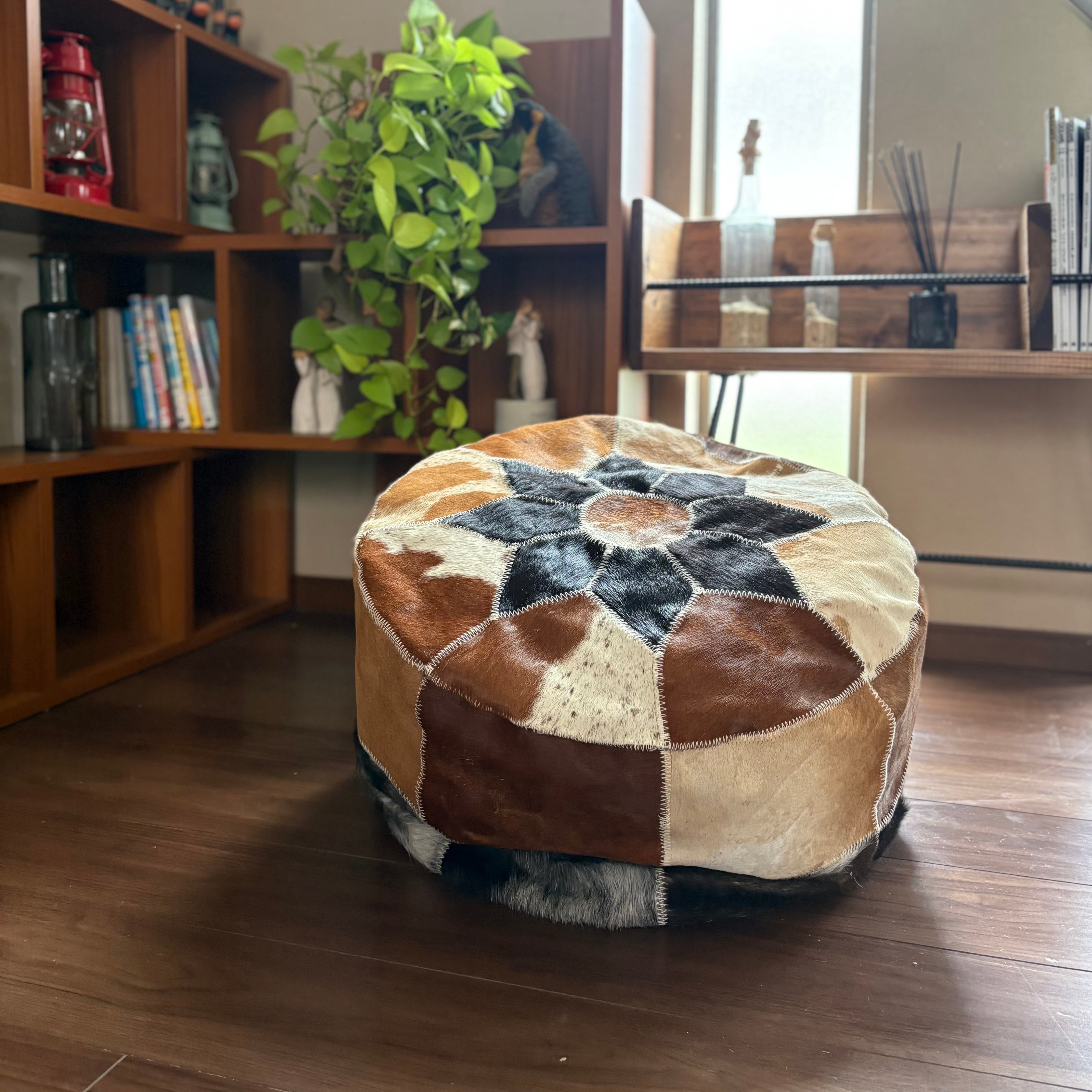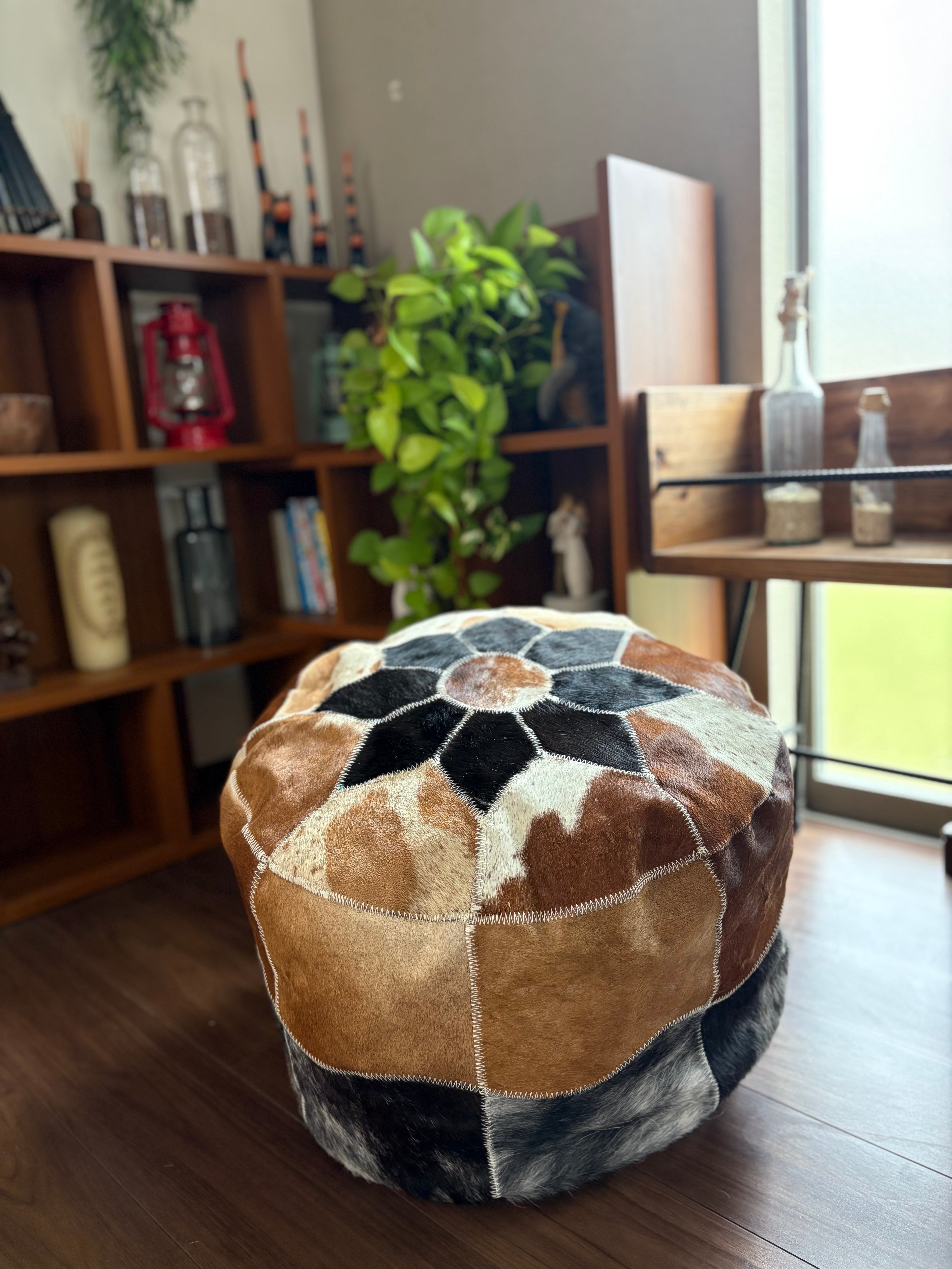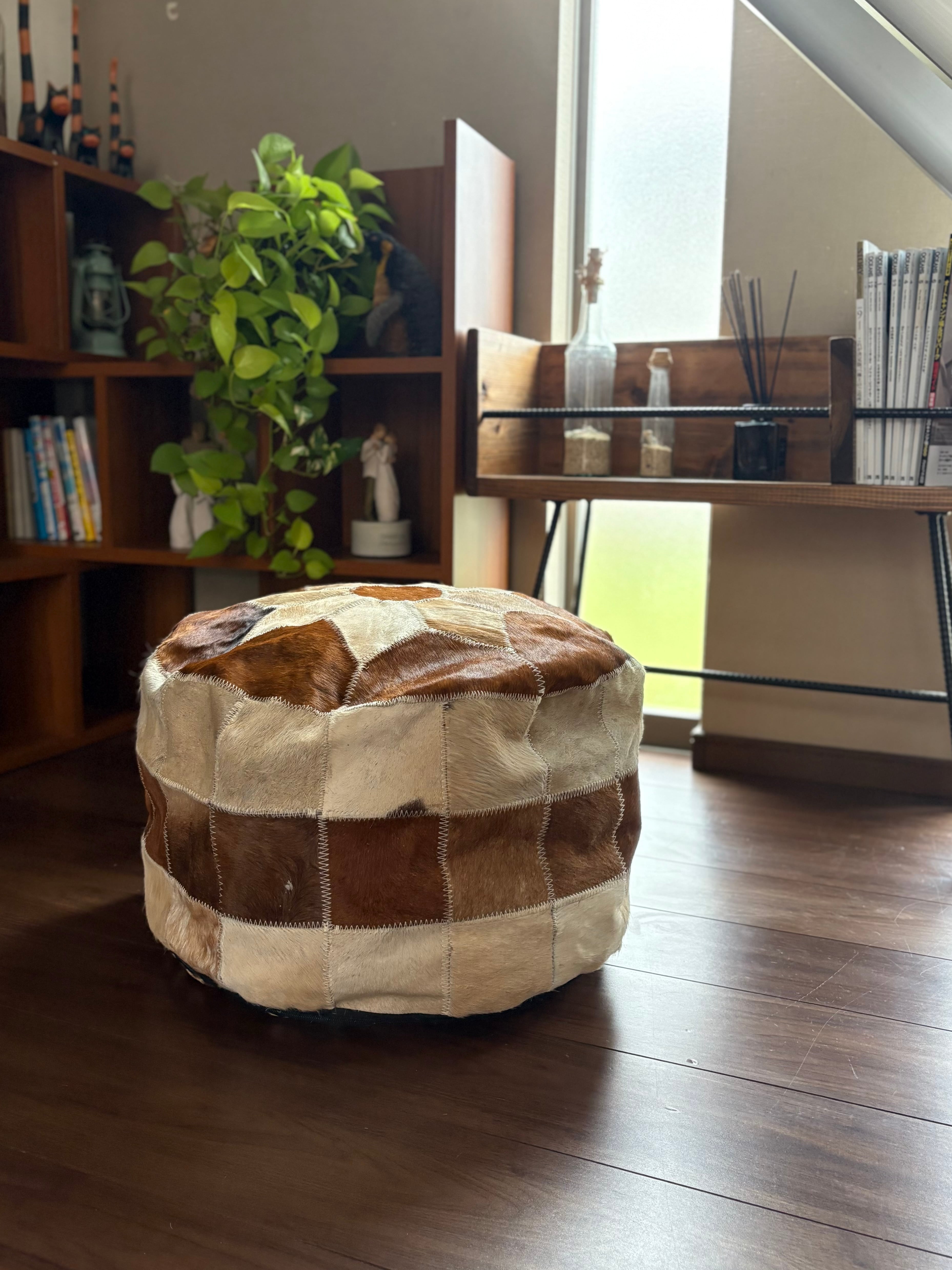 天然の牛革をパッチワークにしたスツールは、ひとつひとつ模様の出方が異なる一点もの。