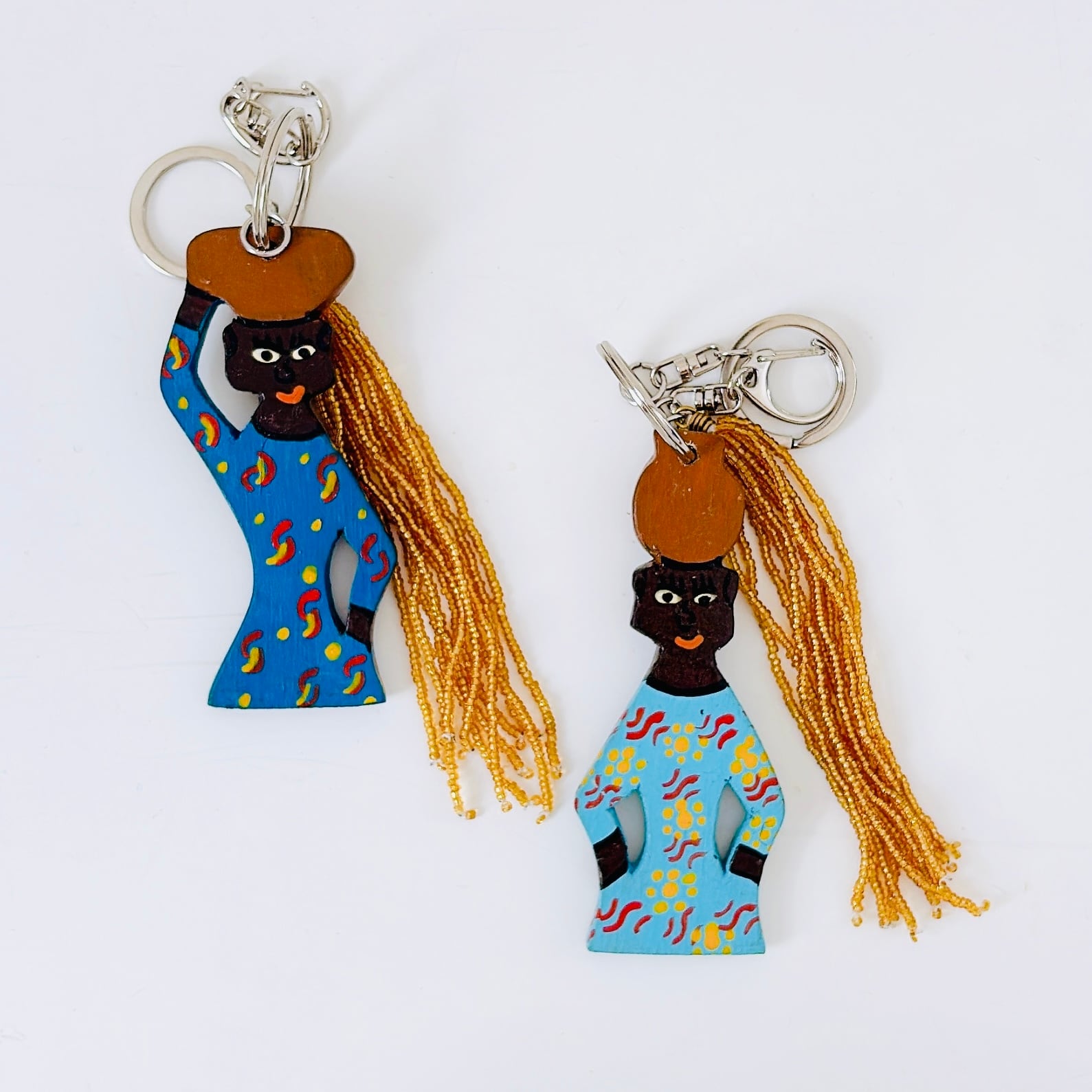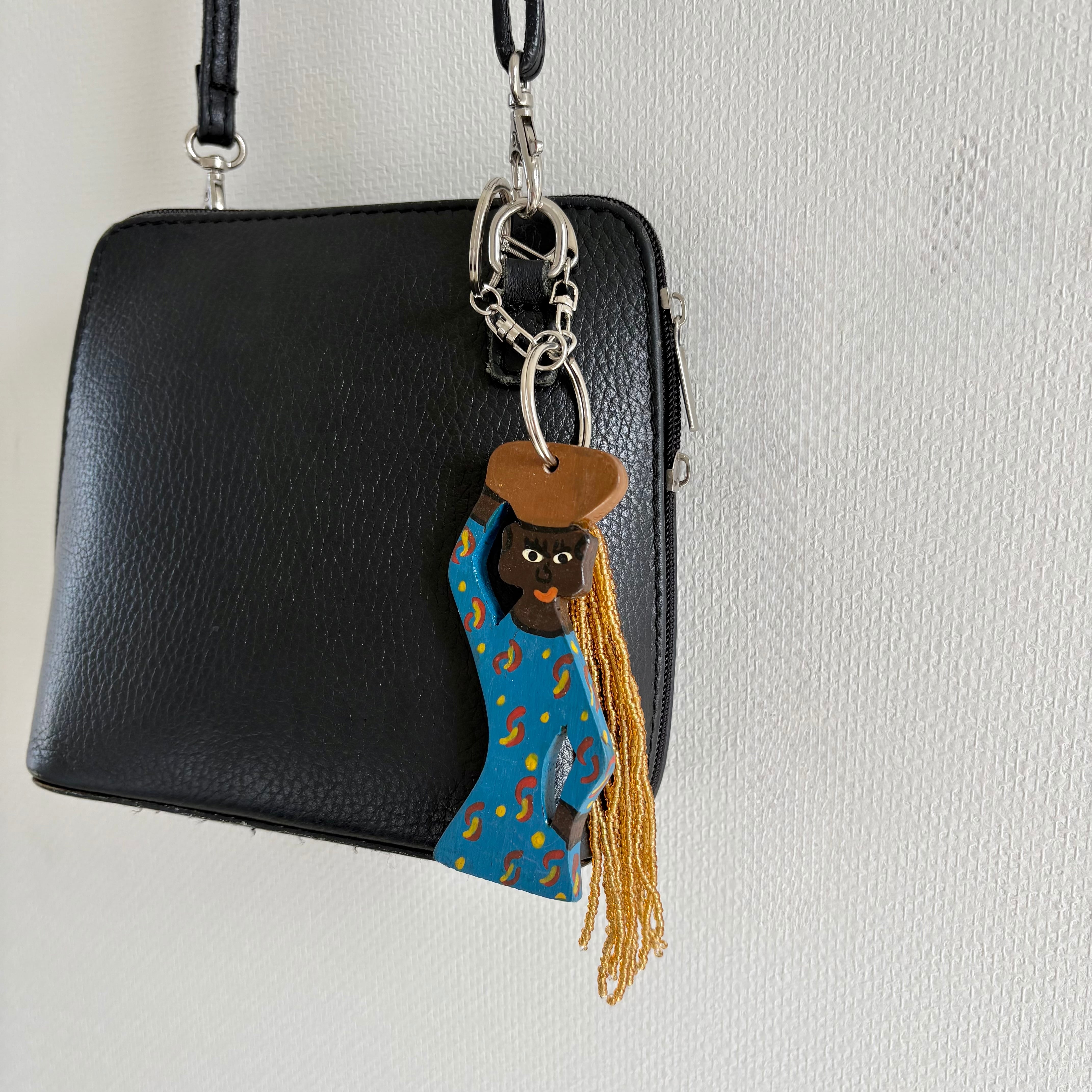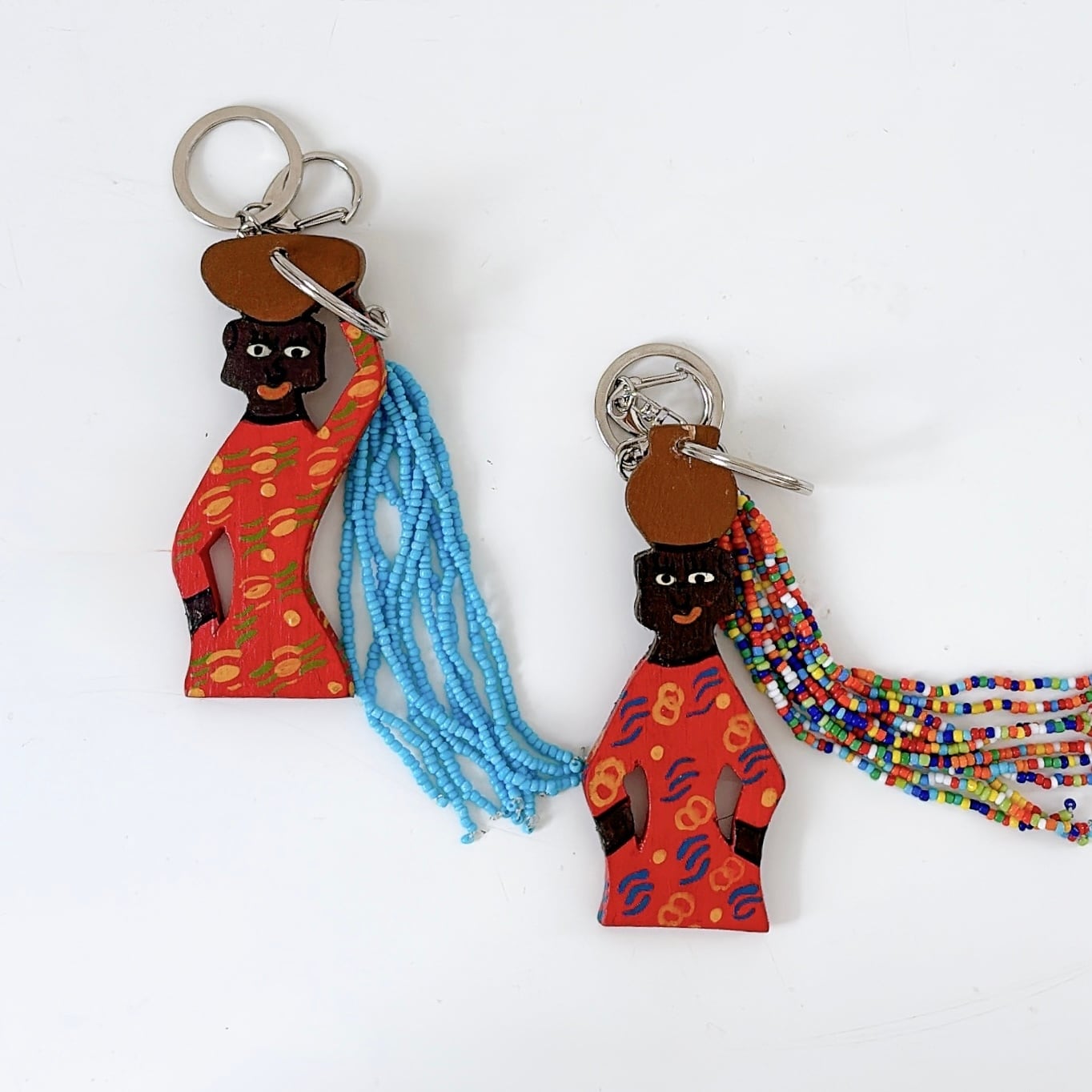 手彫りの木の人形に、一本ずつ通したビーズのタッセルがゆらゆら揺れて、バッグや鍵を明るく彩ります。