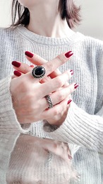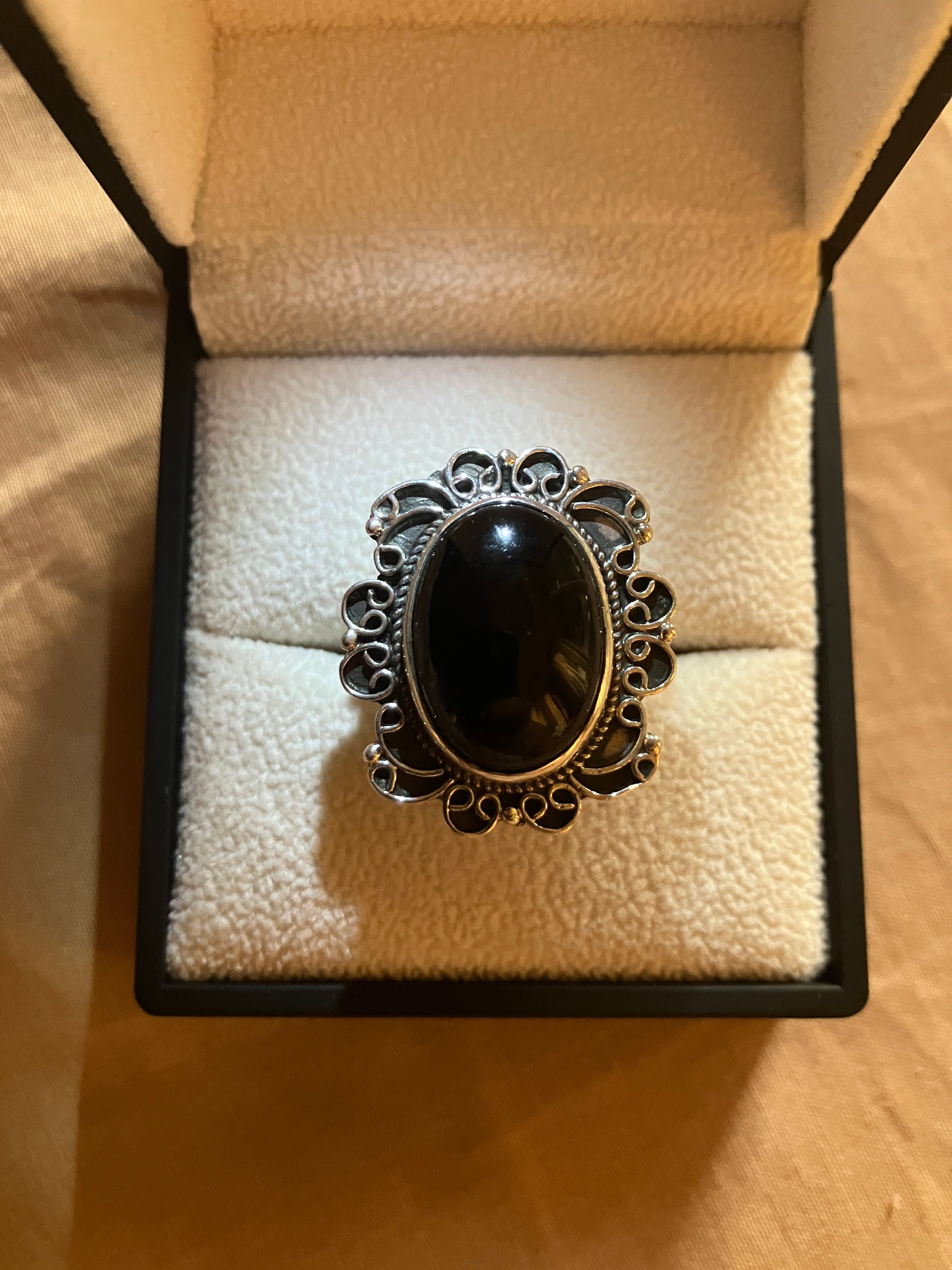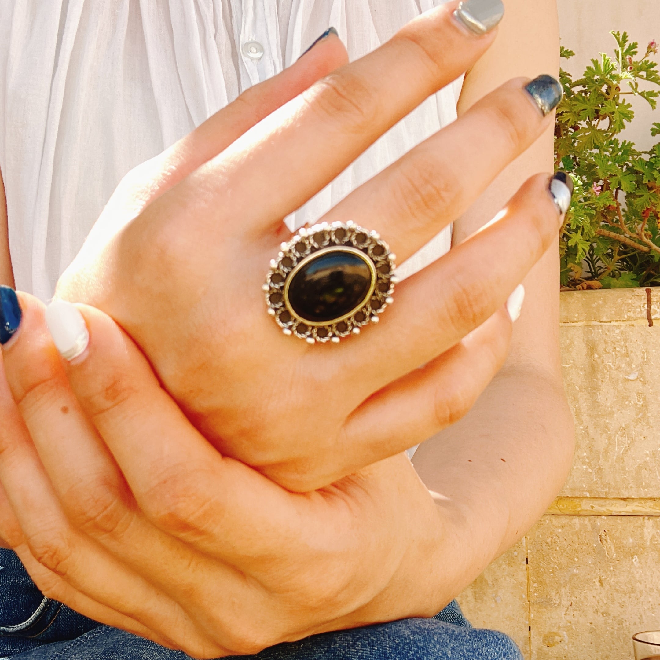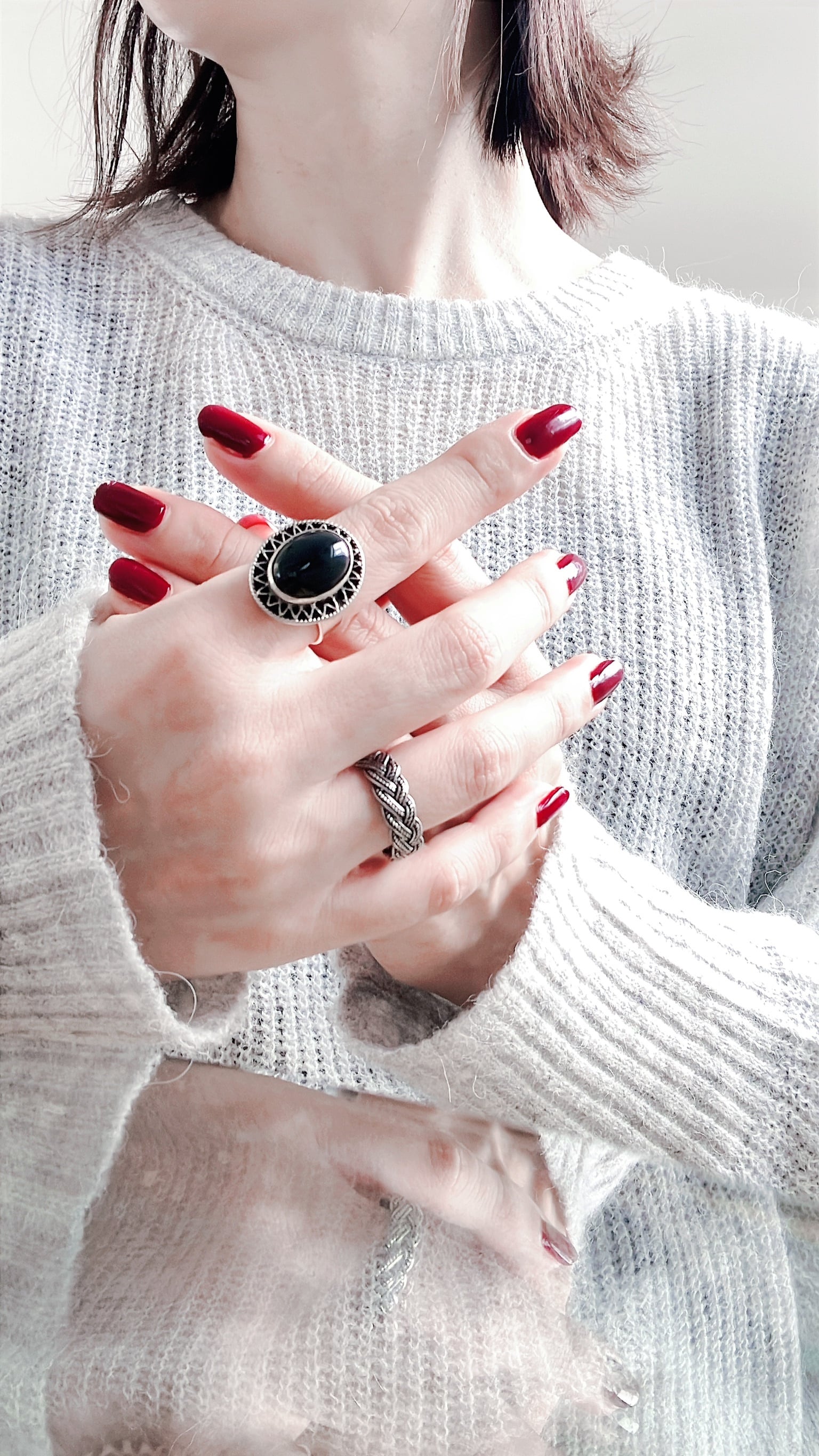 silver 925 :ブラックオニキス シルバ-925 深いブラックが美しいオニキスの大きめリング。 ブラックとシルバーでシックな手元をつくります。 SIZE 14 縦2.7㎝ 横2.2㎝