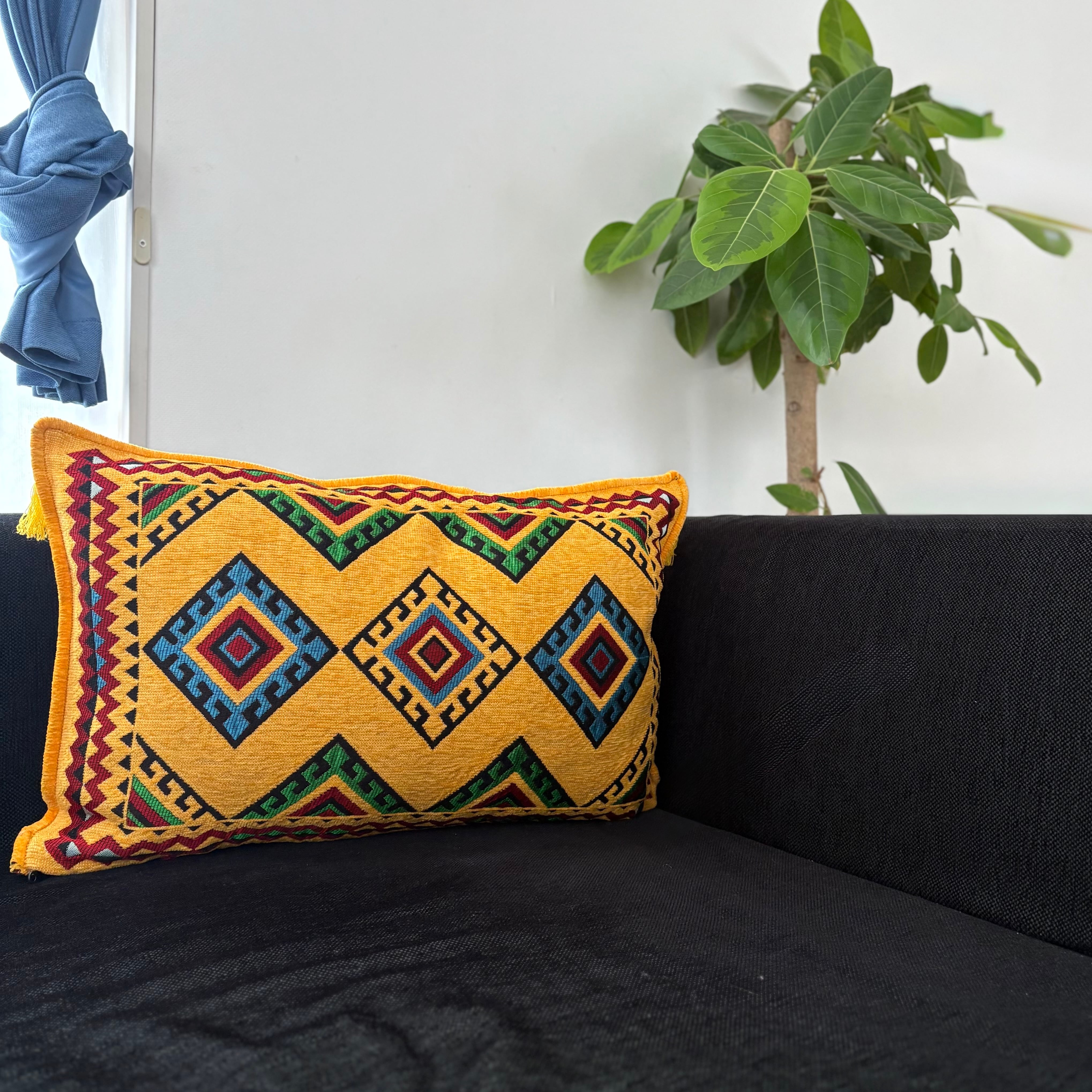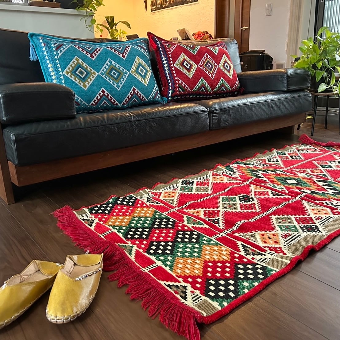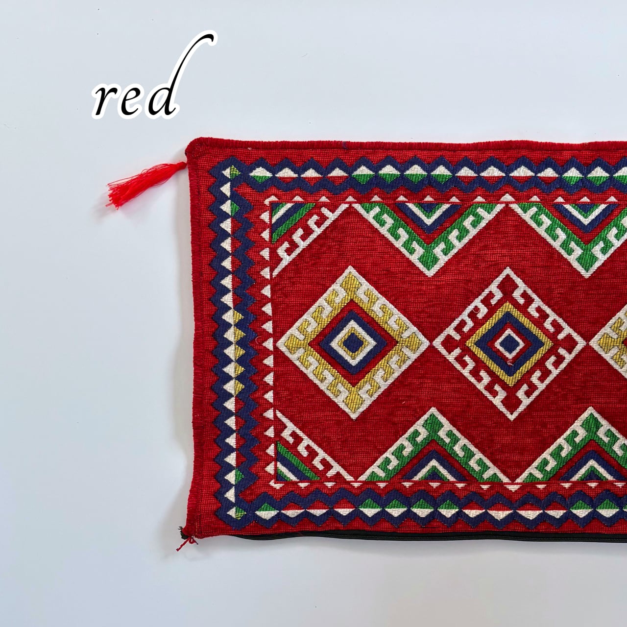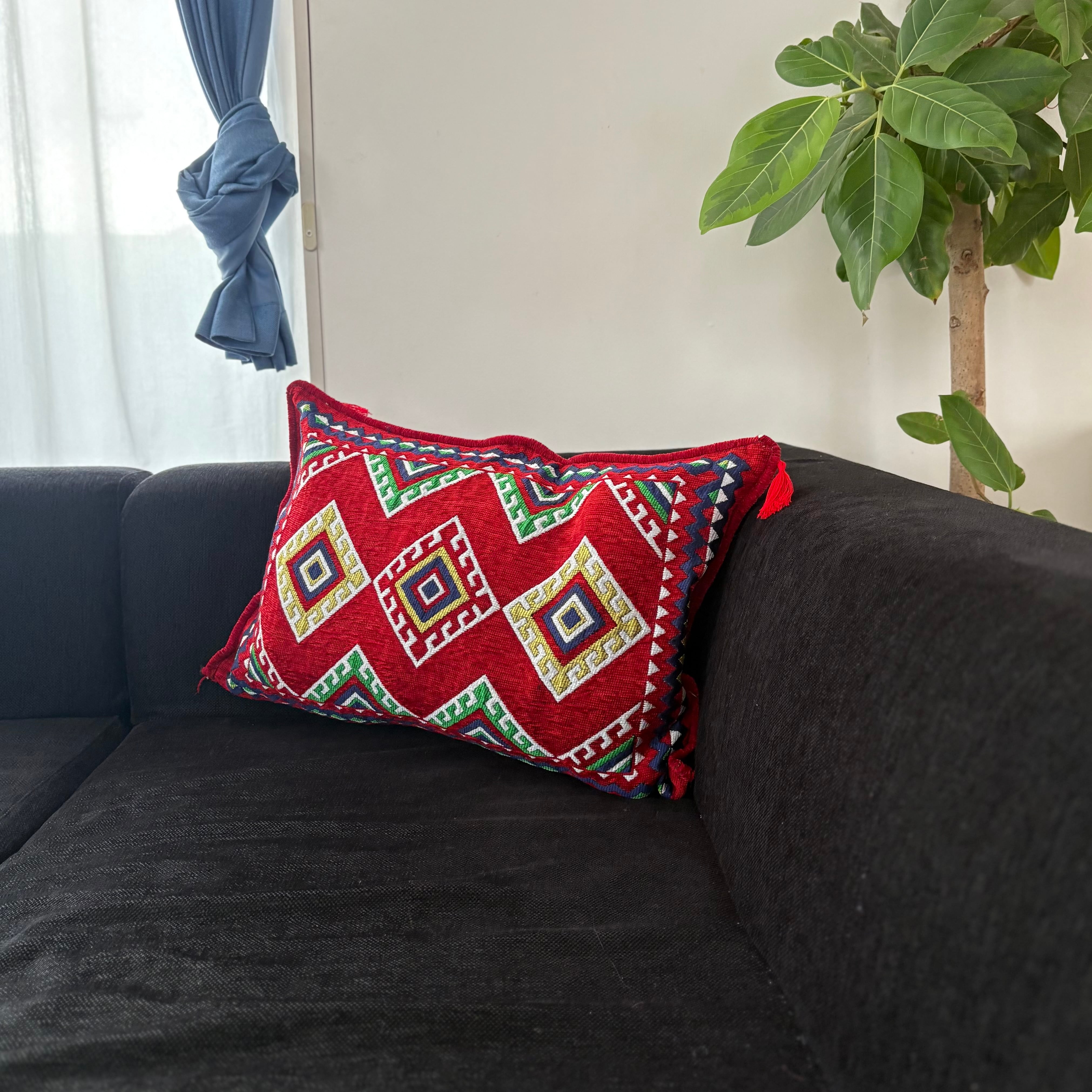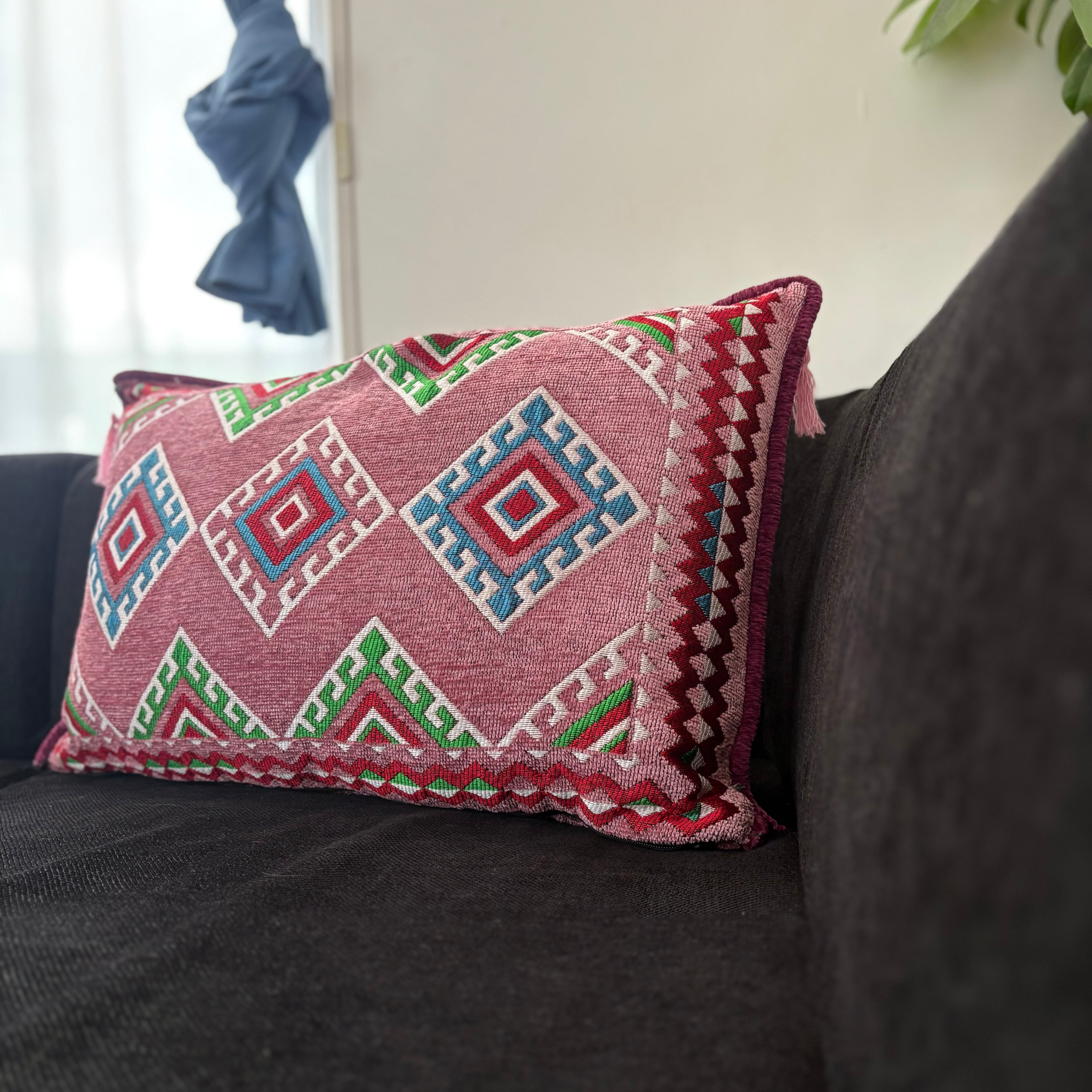 オリエンタルな雰囲気漂う、エジプト製のクッションカバー。 ピンクをベースに、ブルー・グリーン・レッドの幾何学模様が織り込まれた存在感あるデザインです。 ひとつ置くだけで、お部屋がぐっと華やかに。 長方形タイプで、ソファやベッドのアクセントにぴったりです。 サイズ:約70×42cm ────── ※こちらはカバーのみの販売です。 ※手作業で作られた海外商品のため、模様・色味・形・サイズに個体差があります。