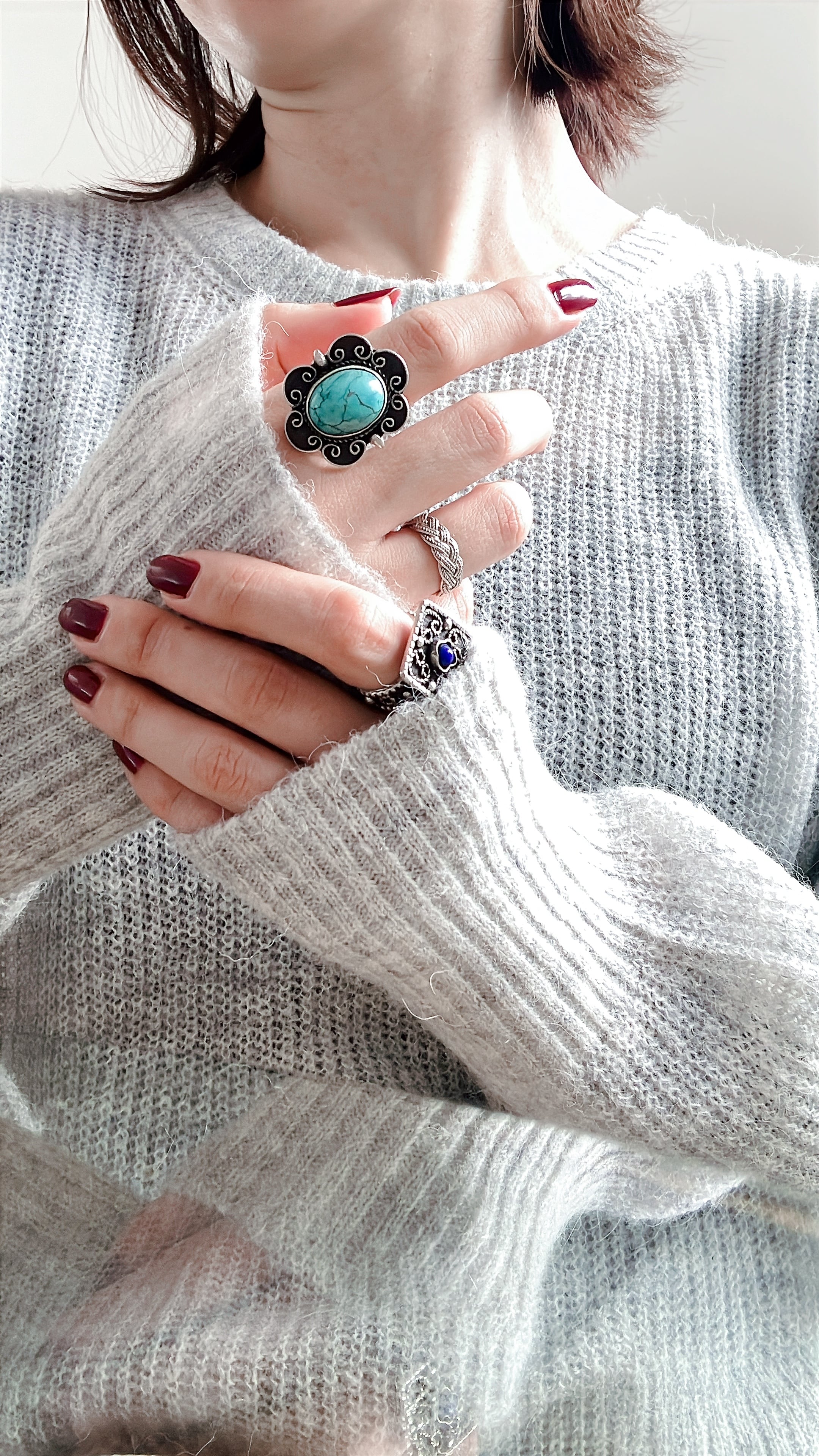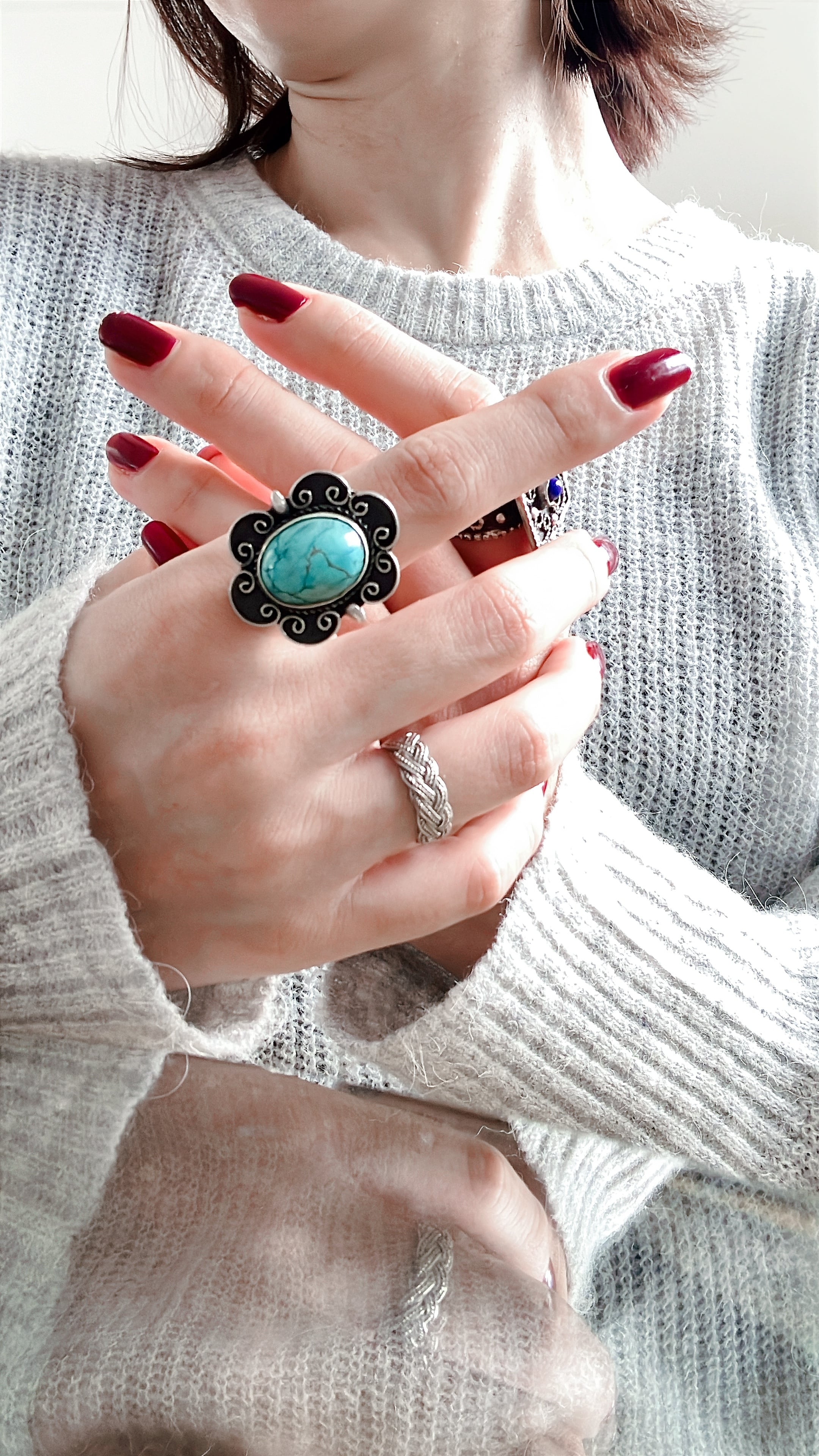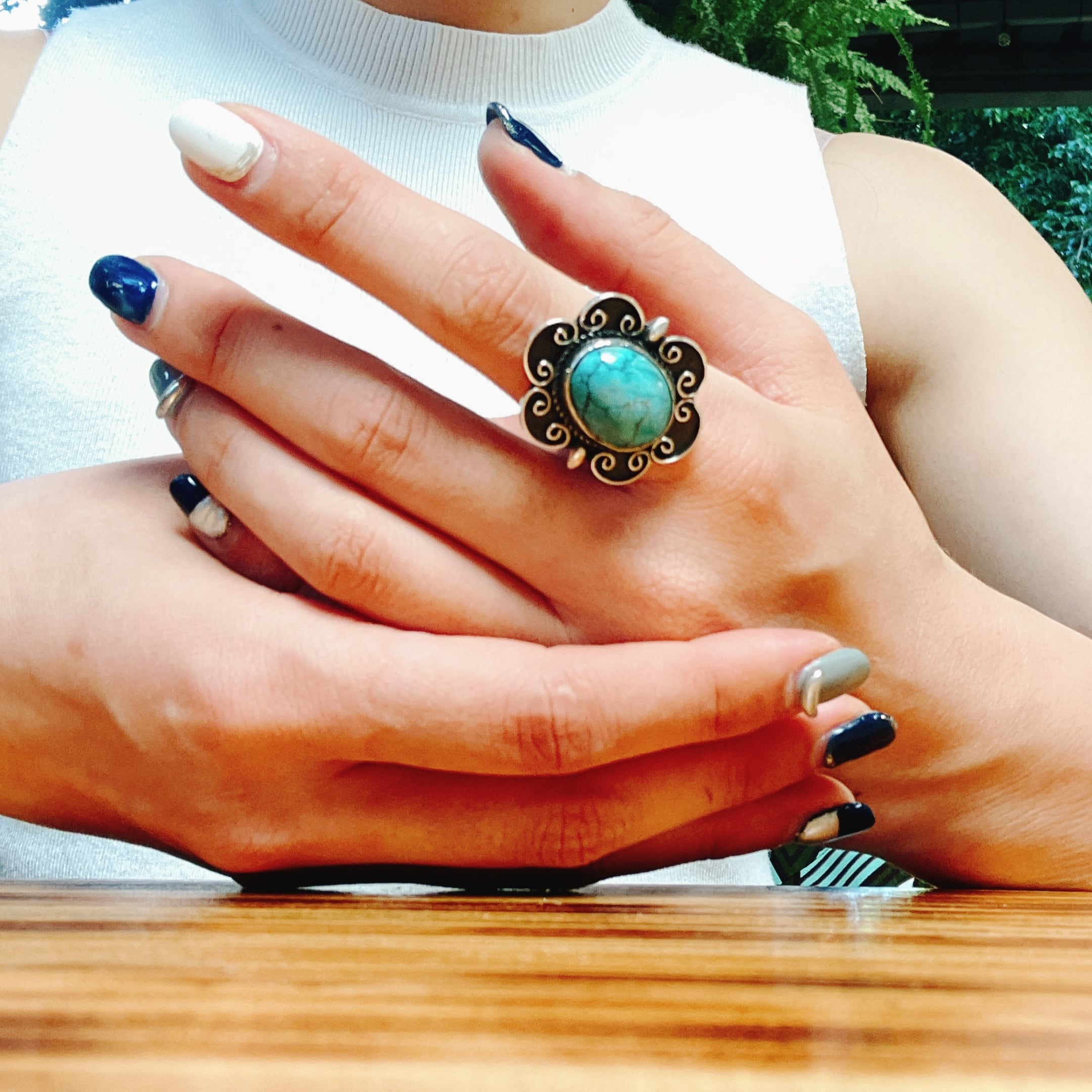 エジプトの老舗シルバーショップからのピュアシルバーリングが登場! シルバー925 一際大きくて美しいターコイズがはめ込まれたスペシャルなリング。ターコイズ好きにはお馴染みの美しいヒビの模様が入っています。豪華で誰もが必ず目を奪われる世界にひとつだけの特別なリング。 アフリカからの多くのエネルギーを感じてください。 サイズ:オープンリング 一番小さくして10号
