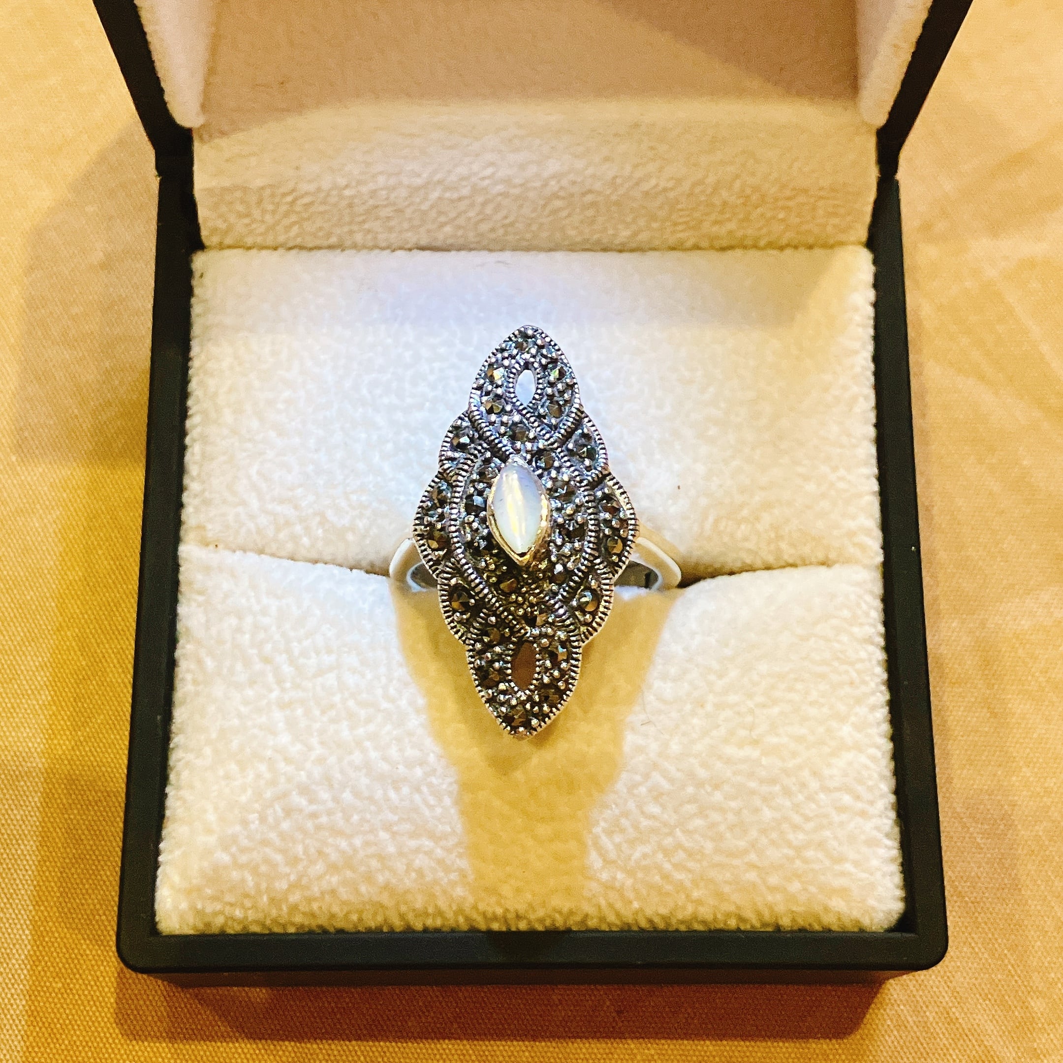 真ん中にwhite agata をはめ込んだジルコニアがキラキラ光るインパクトリング