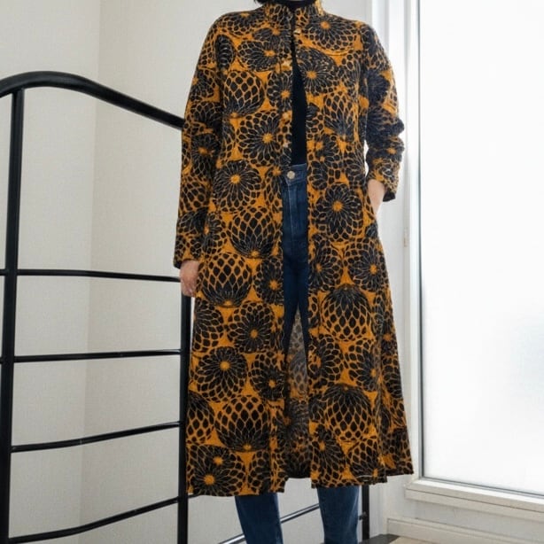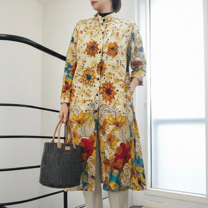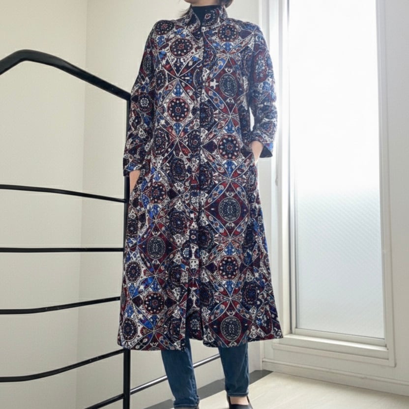 1枚で主役になるデザインで、ボタンを閉じてワンピースとして、また前を開けてコートのような羽織りとしてもご着用いただけます。