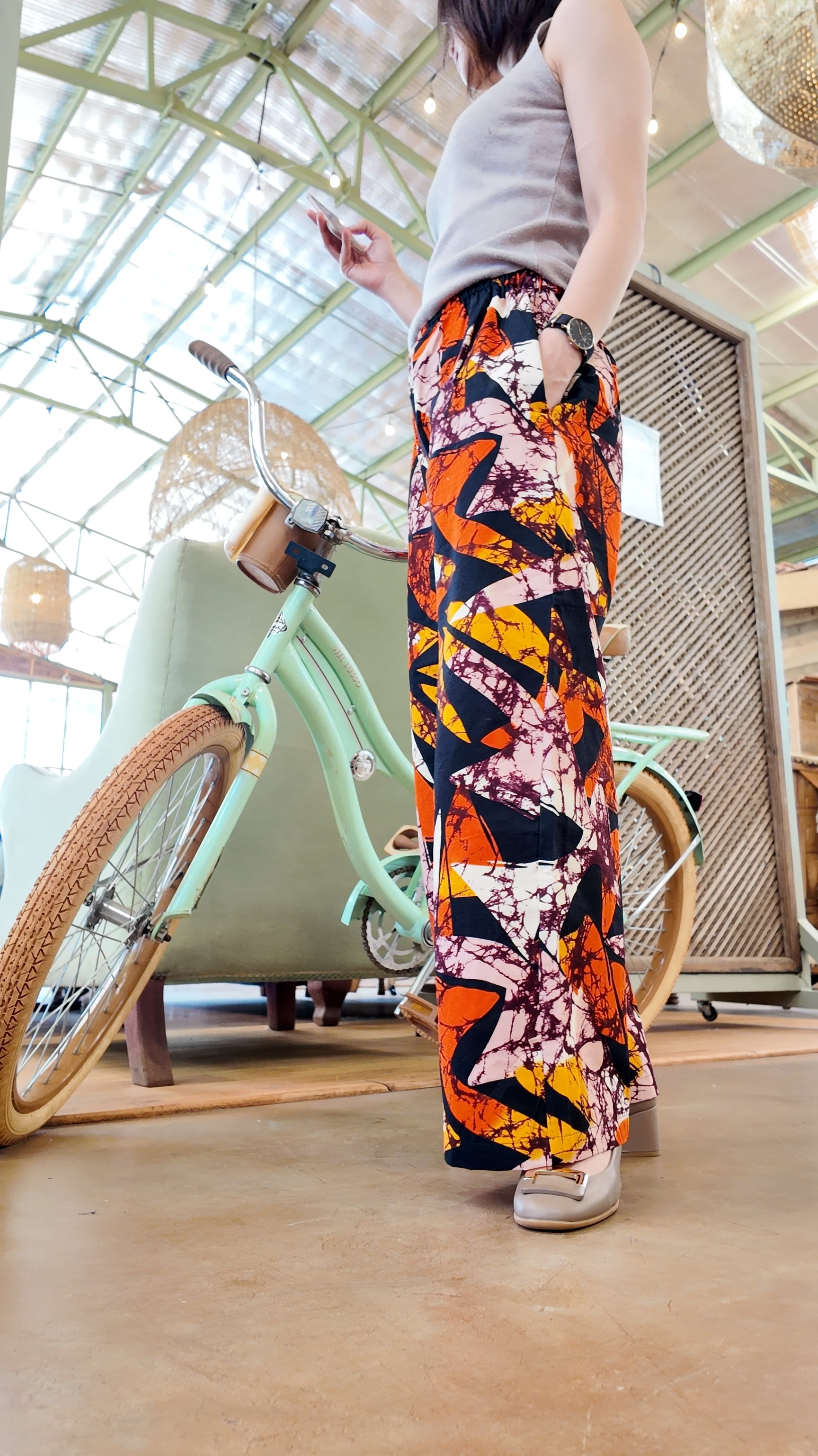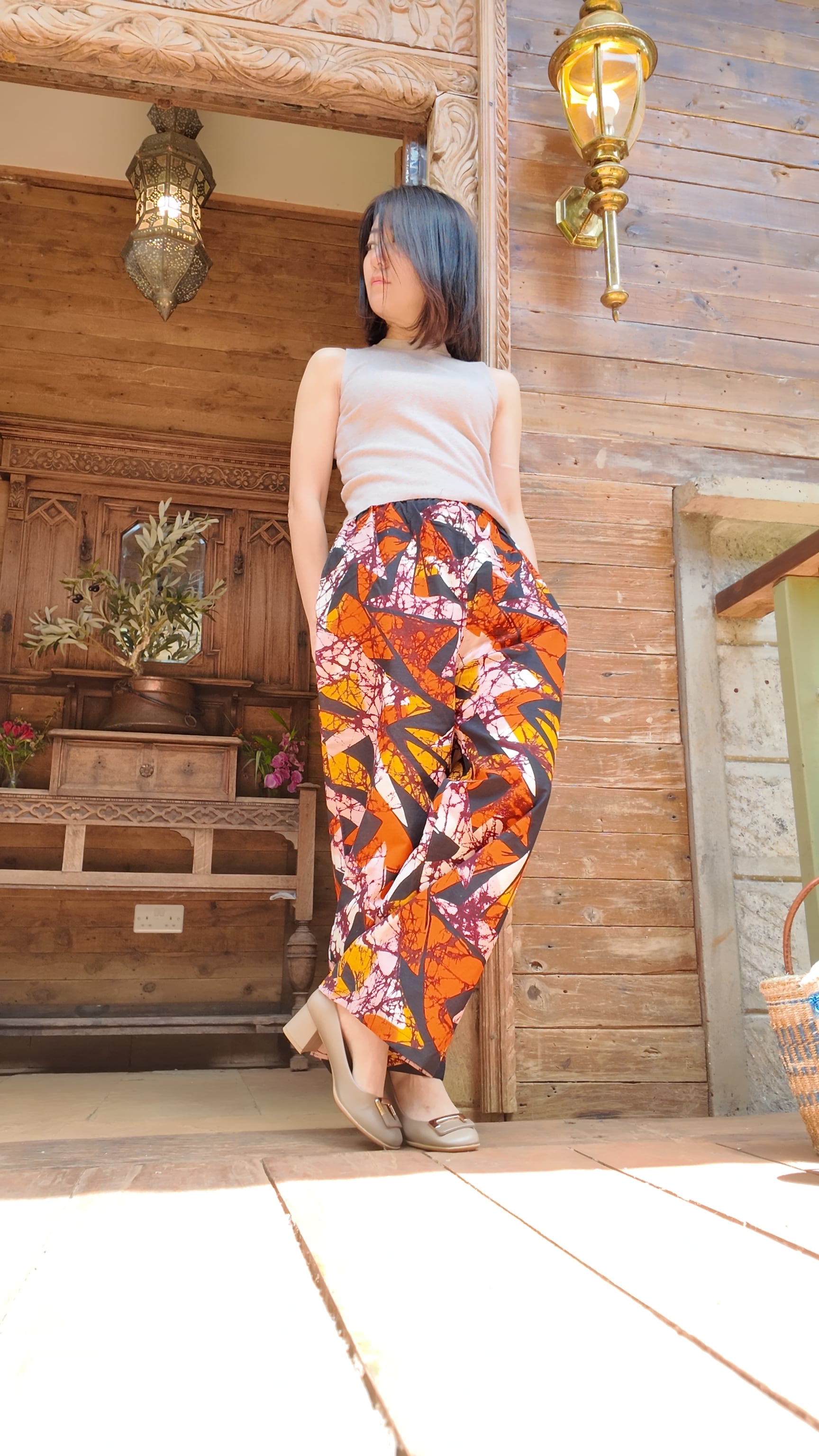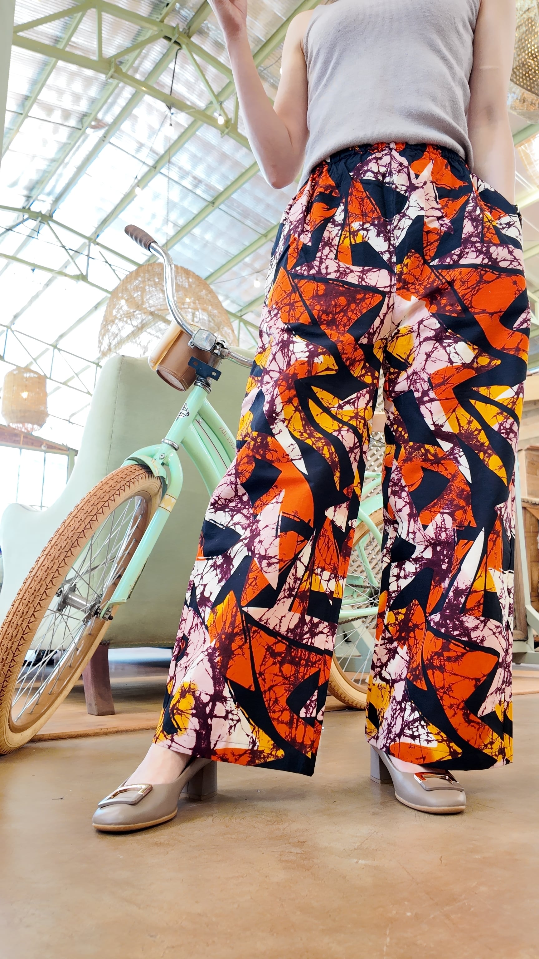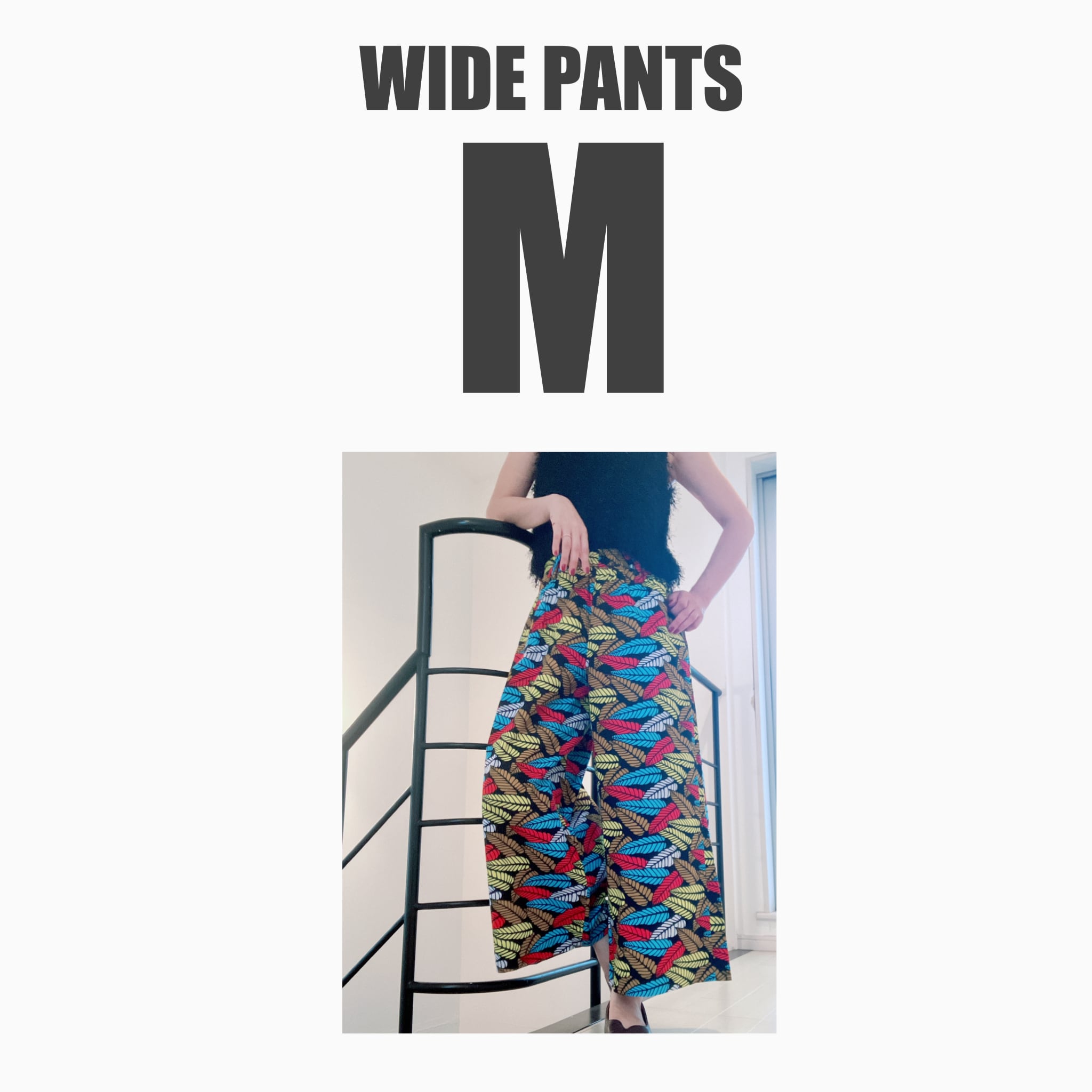 アフリカ布の明るさとユニークな柄たちがアクセントとなり、生活を楽しく明るくしてくれるワイドパンツ。