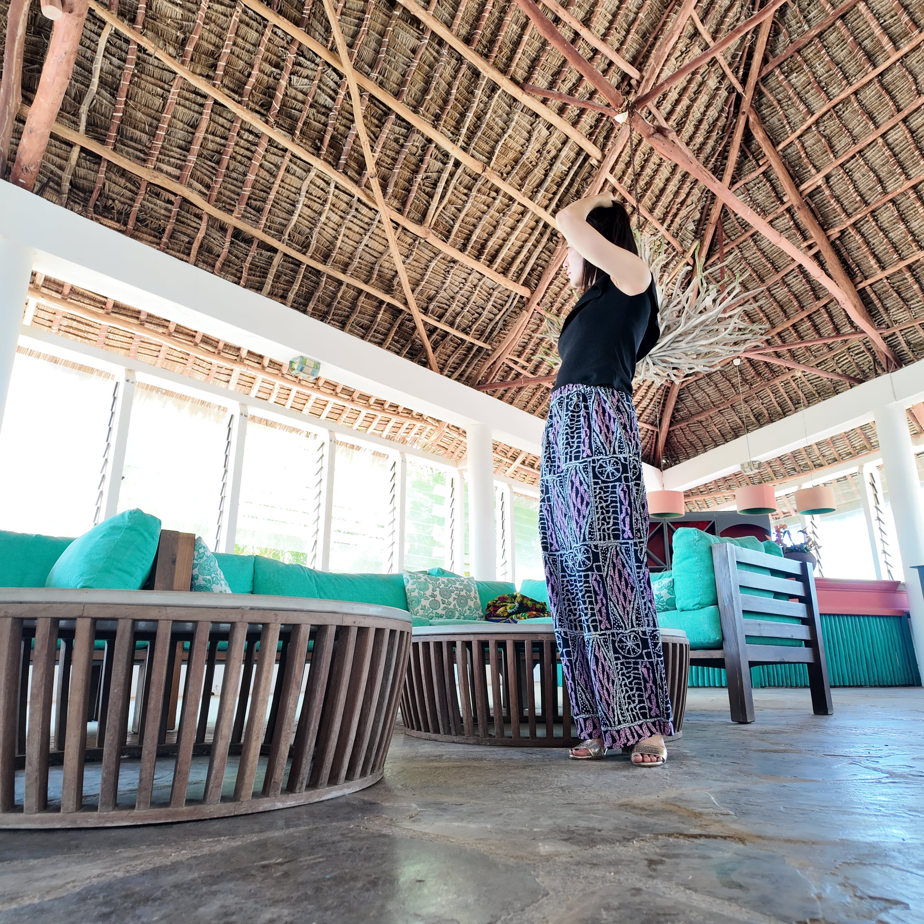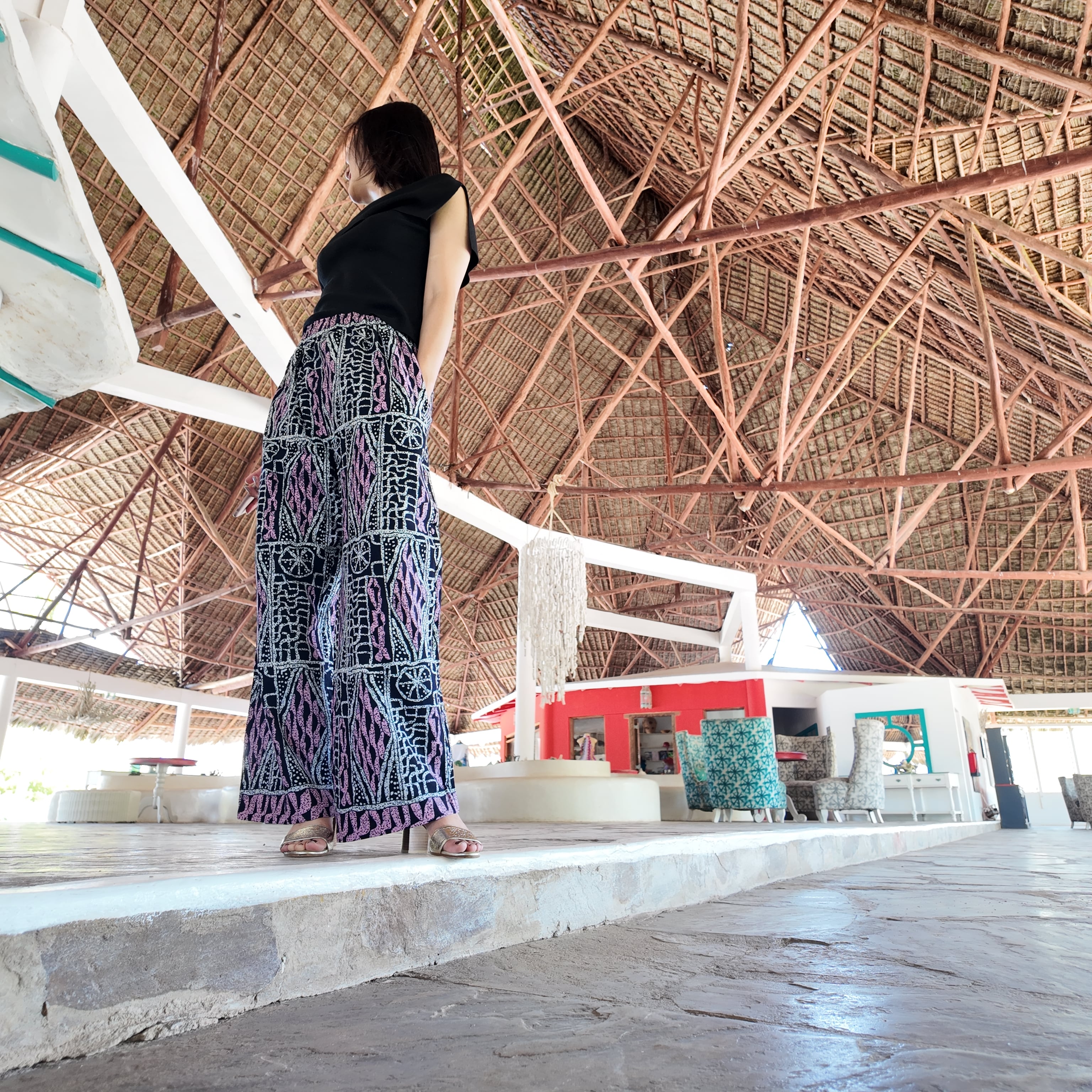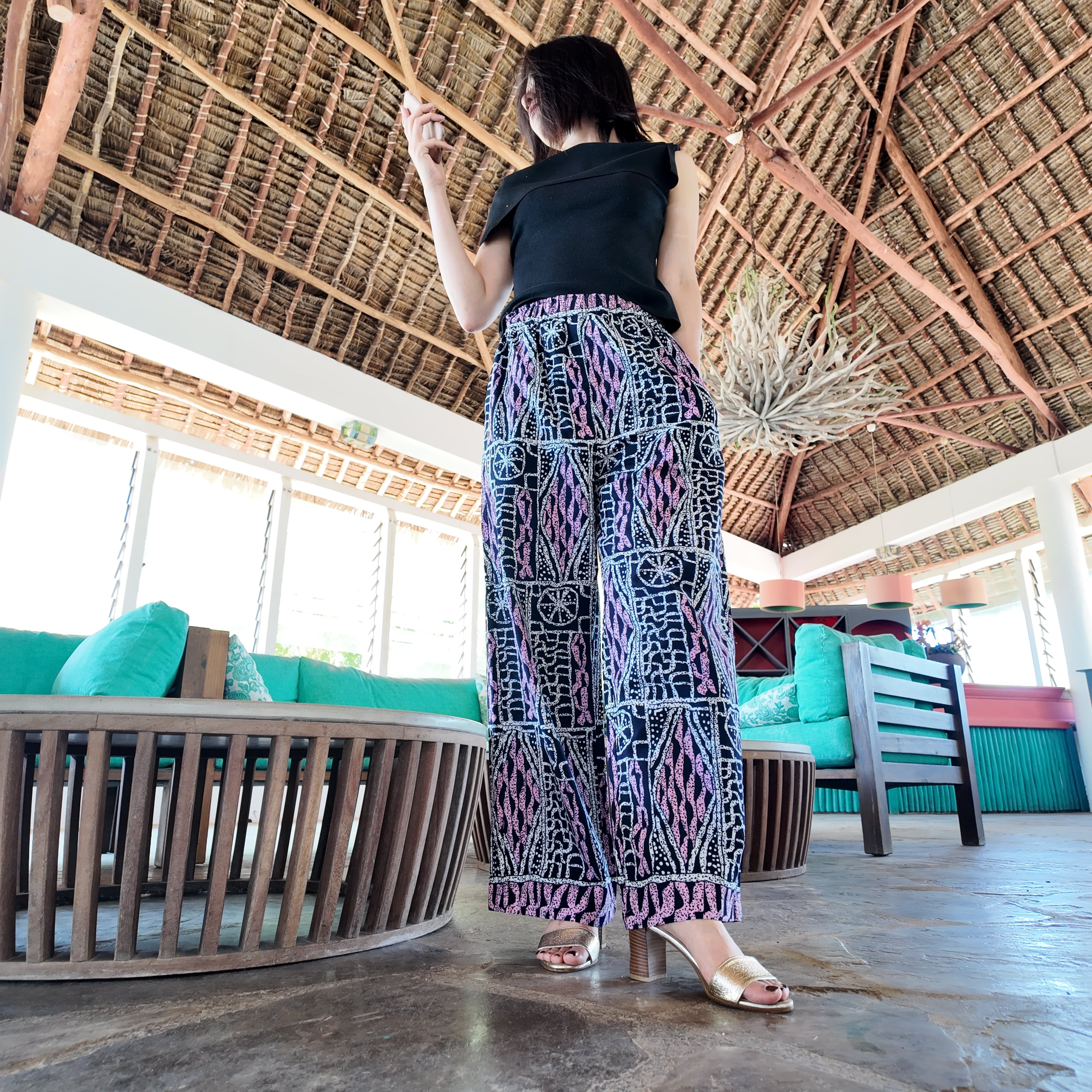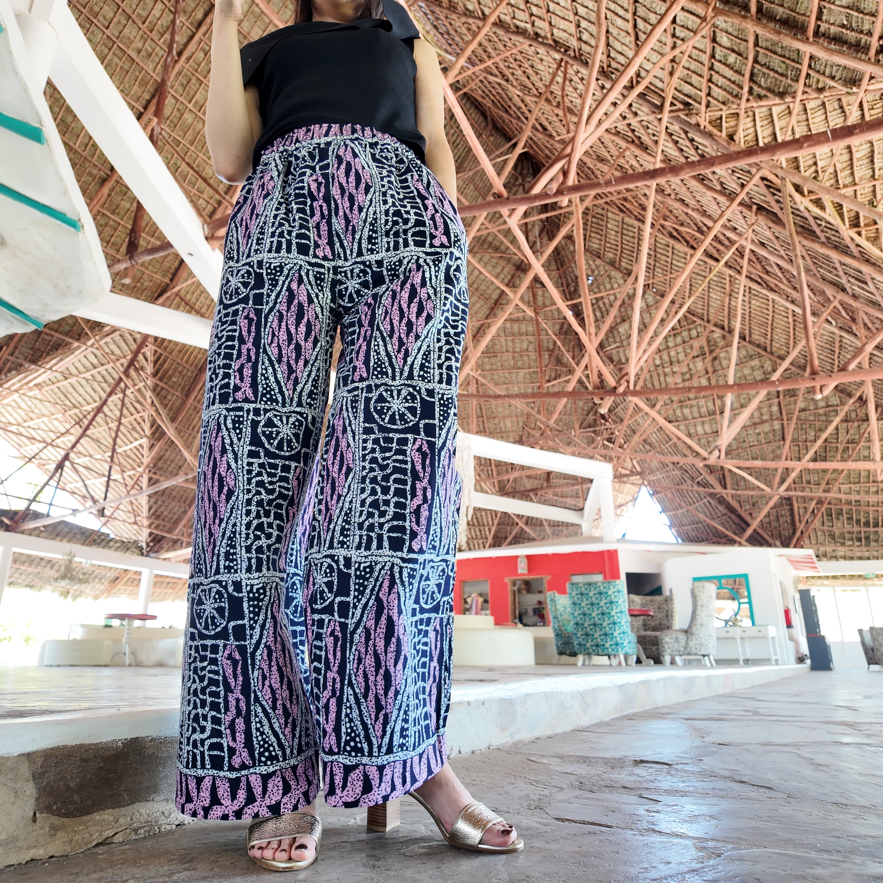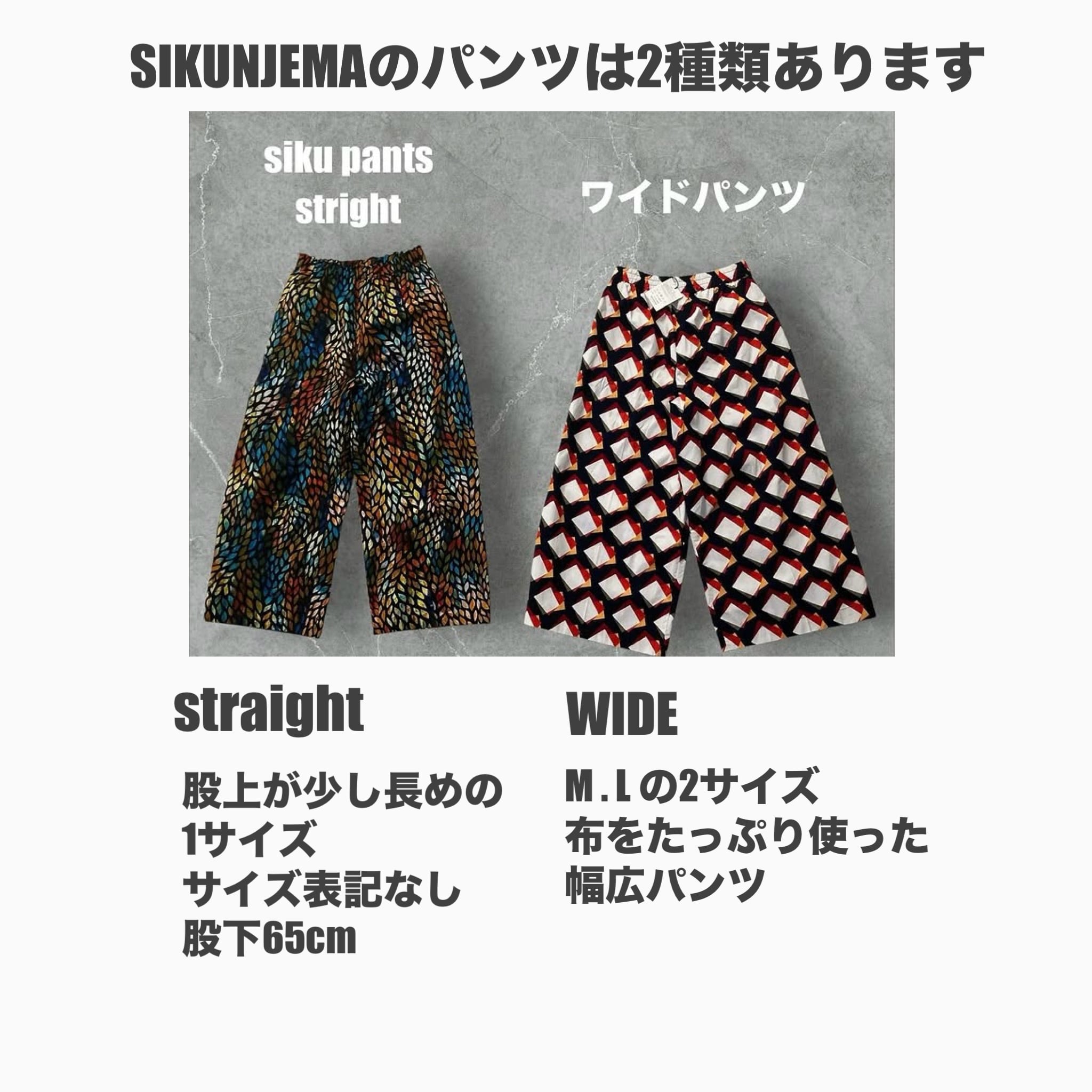アフリカ布の明るさとユニークな柄たちがアクセントとなり、生活を楽しく明るくしてくれるワイドパンツ。