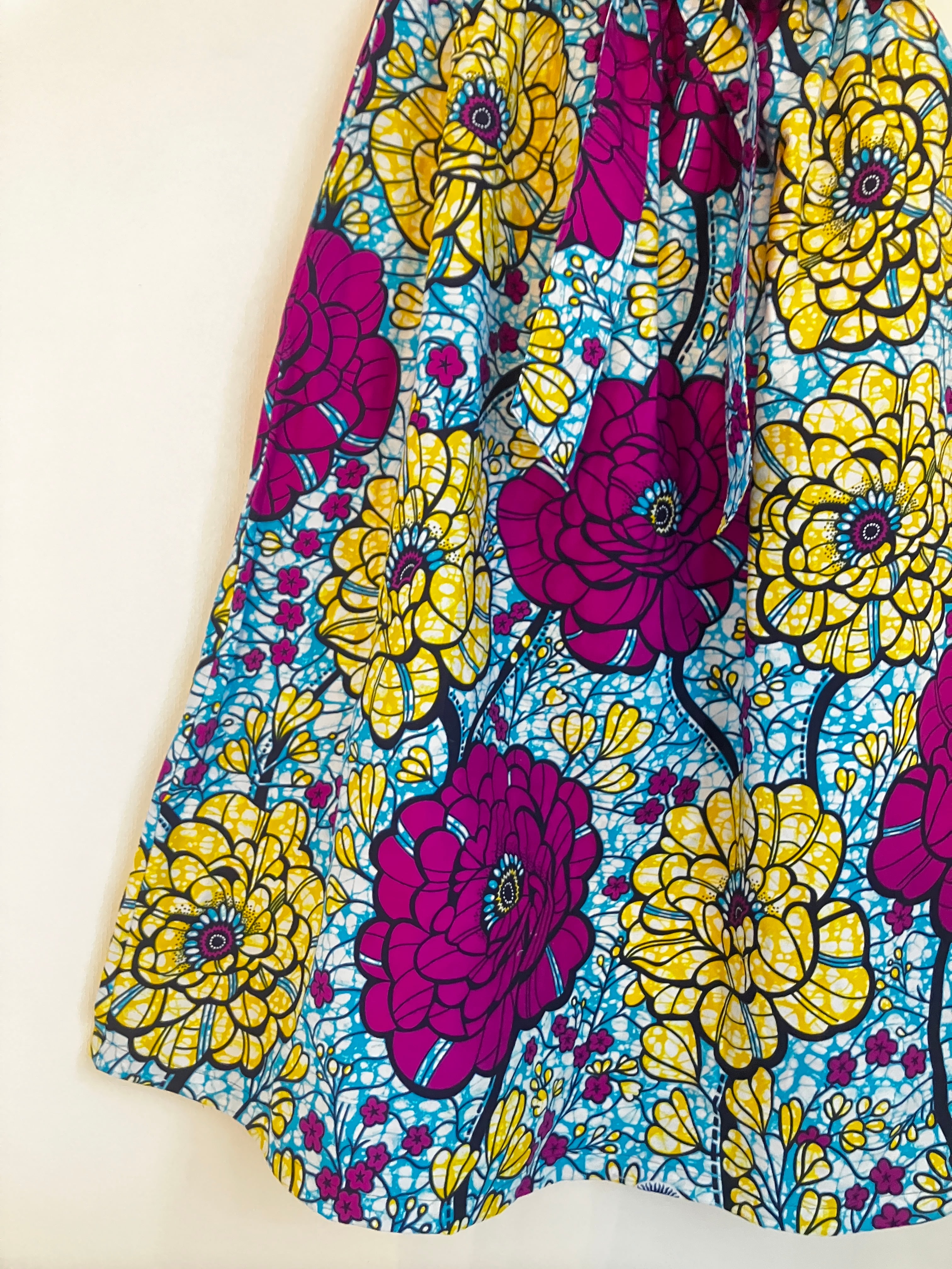 ウエストはゴム67cmですが、ビヨーンと引っ張ると、100cmに。お腹周りが心配な方もウエストゴムのやさしいスカートをご着用いただけます。また、ゴムの周りに同じ布でリボンをつけました。ウエストは楽ちんだけど、ちょっと外でお出かけする時もおしゃれにご着用いただけます。