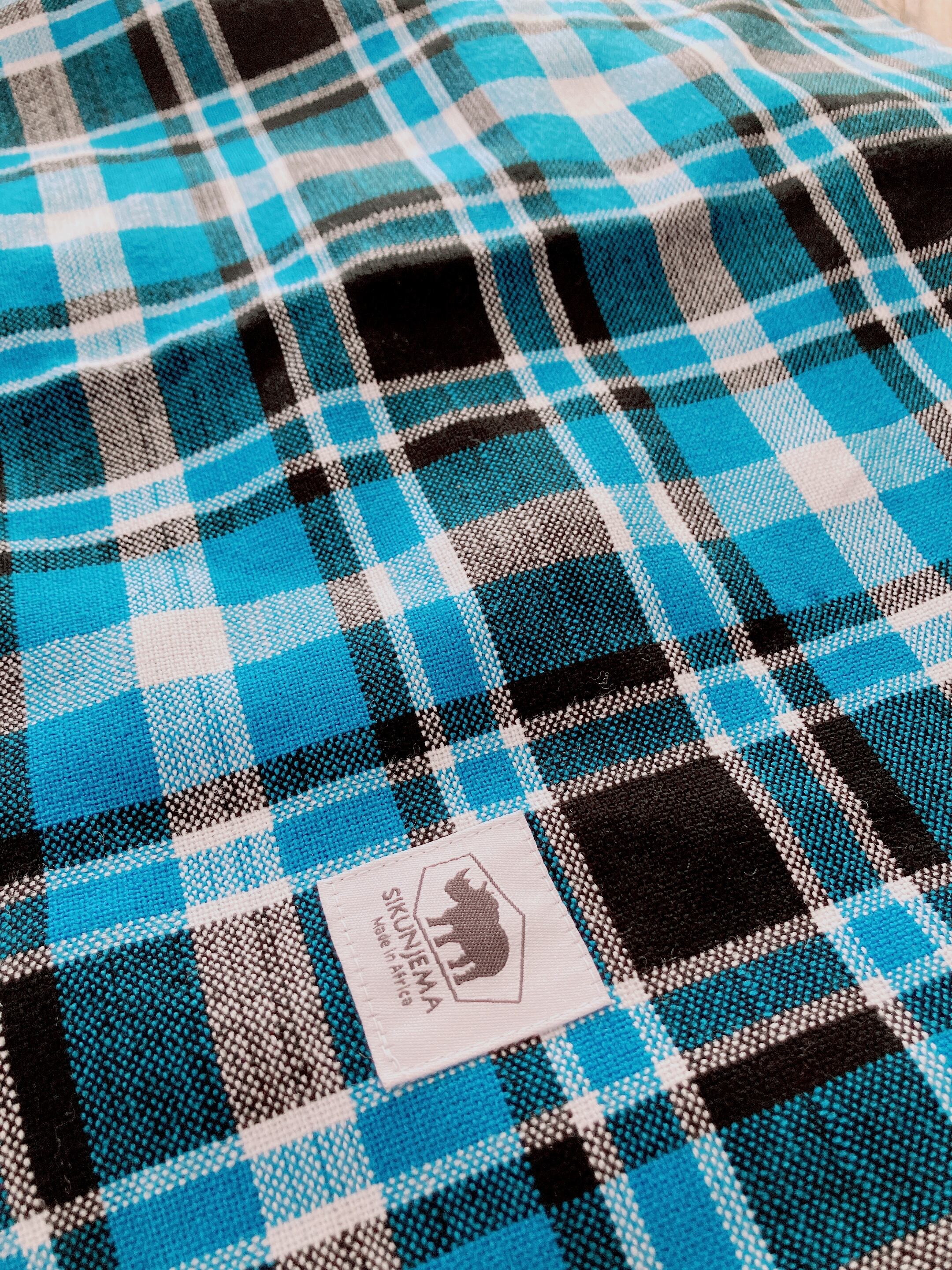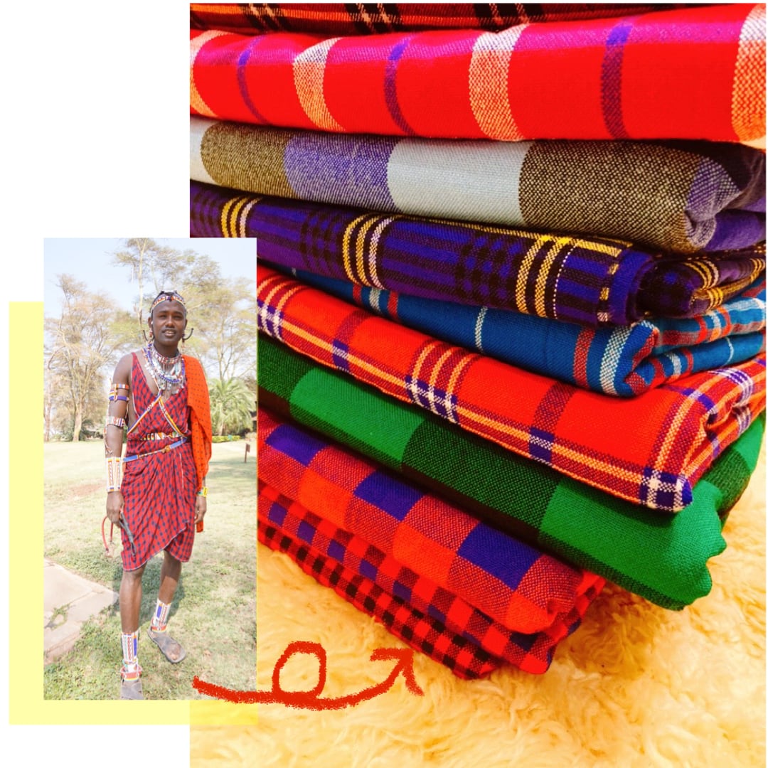 使い方いろいろのマサイシュカ。色も赤が基本のマサイ族ですが、オレンジやブルーもでています。共通するのはチェックであること。