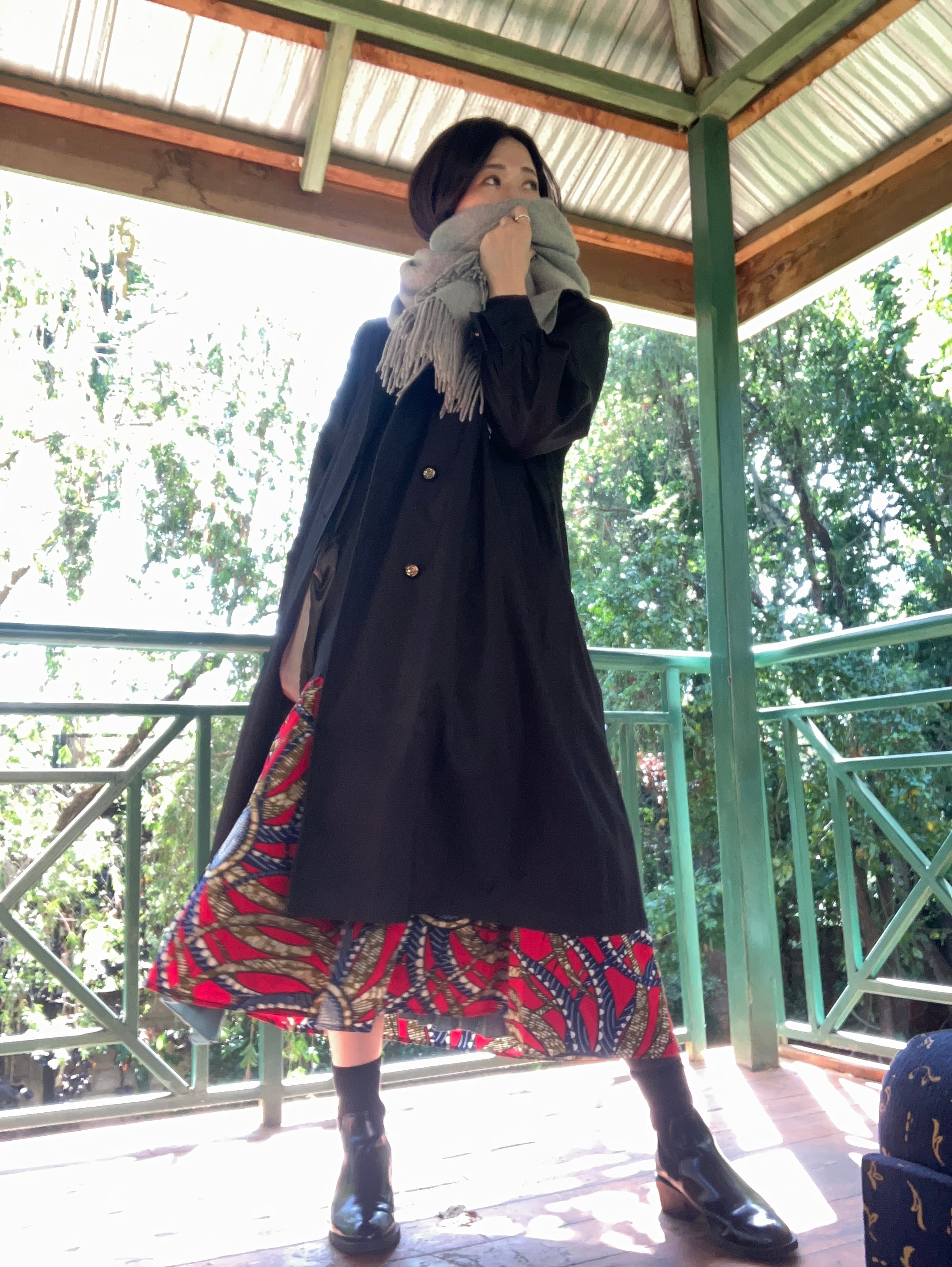 ゆったりと着心地良く、ストレスフリーにご着用いただけます。また、冬にロングセーターと合わせても着られるように考えて作りました。セーターやコートの裾からひらひらとでるアフリカ布は色のポイントとなり、ダークな服が多くなる冬にもってこいです。