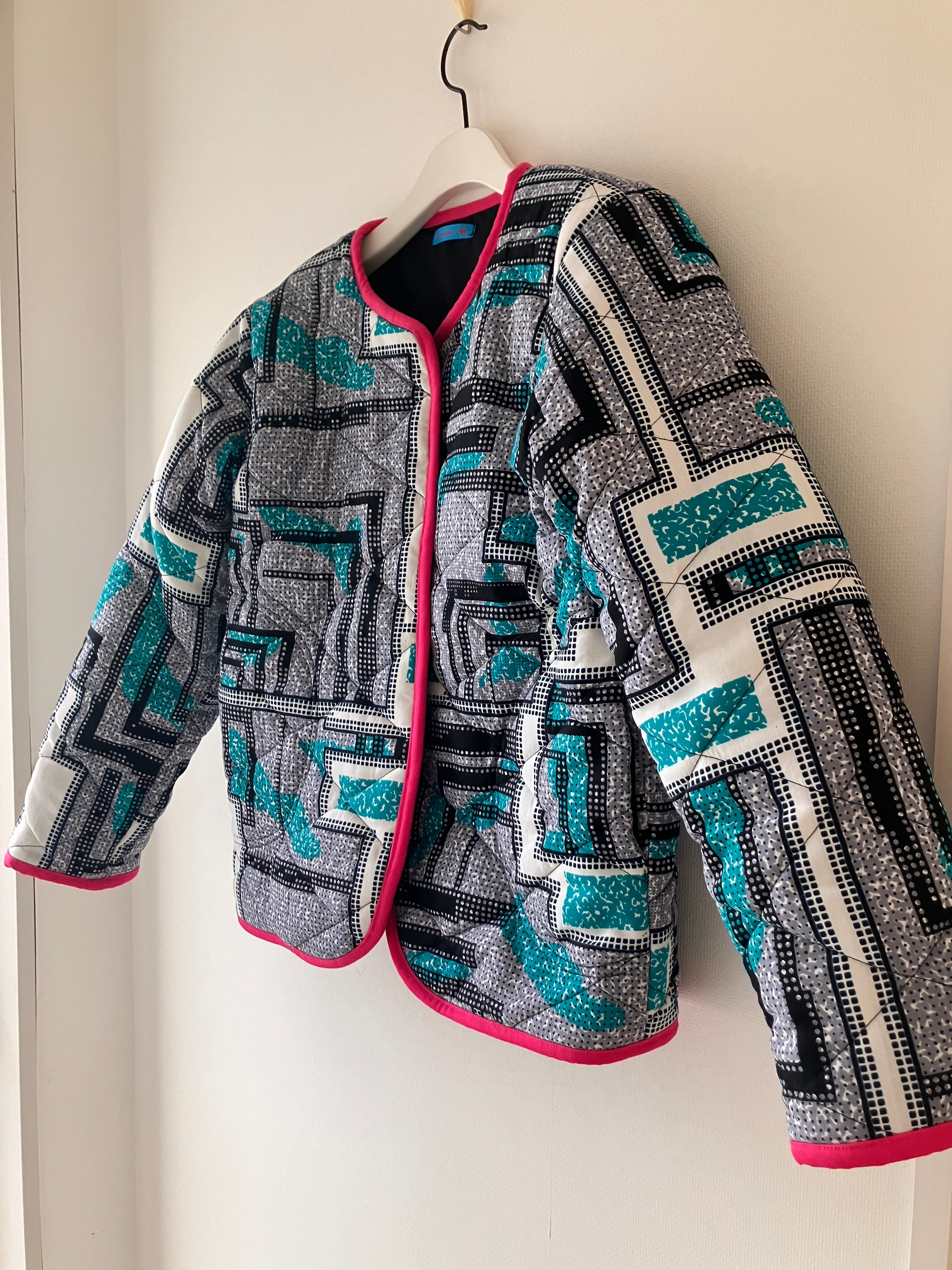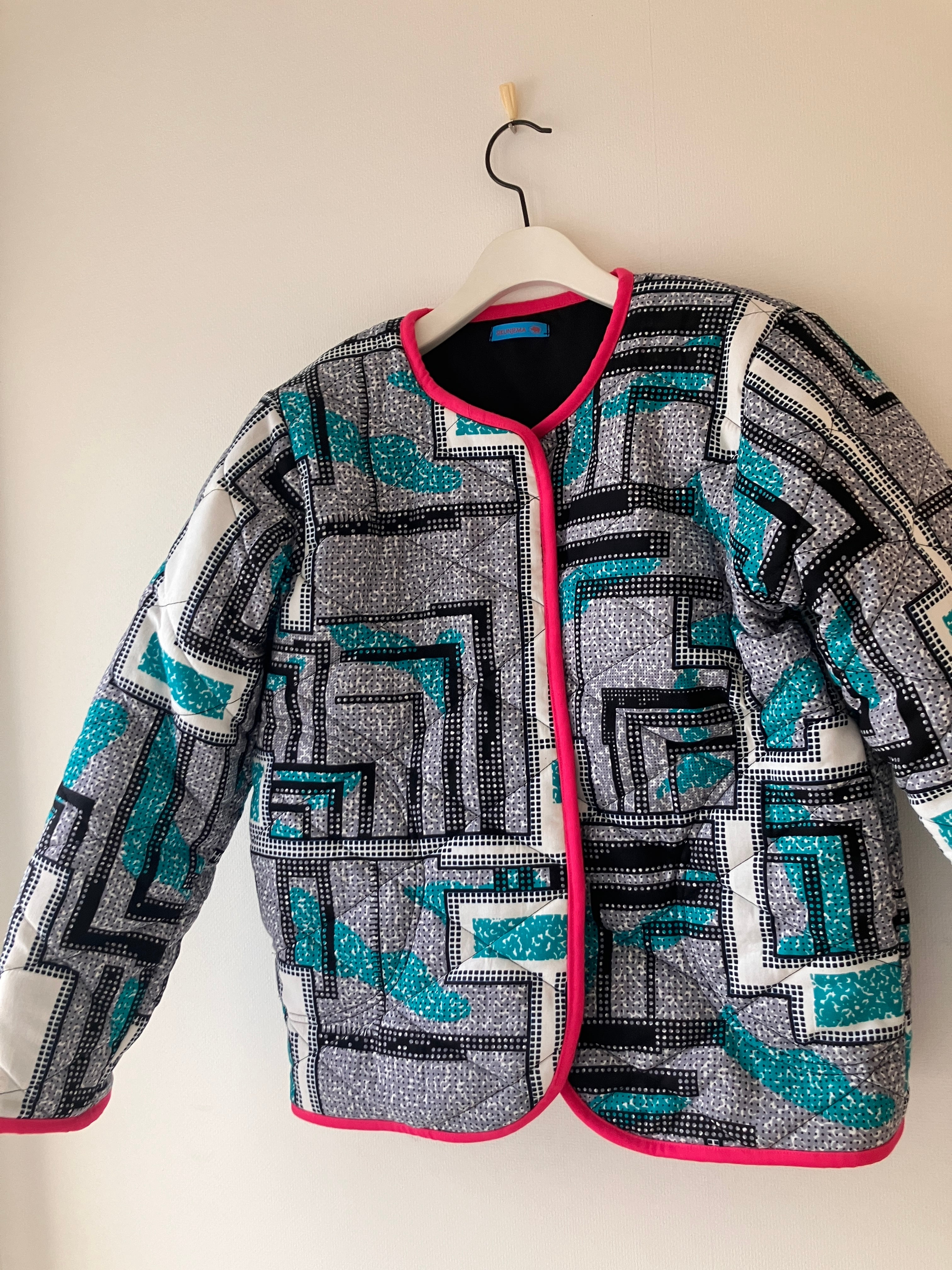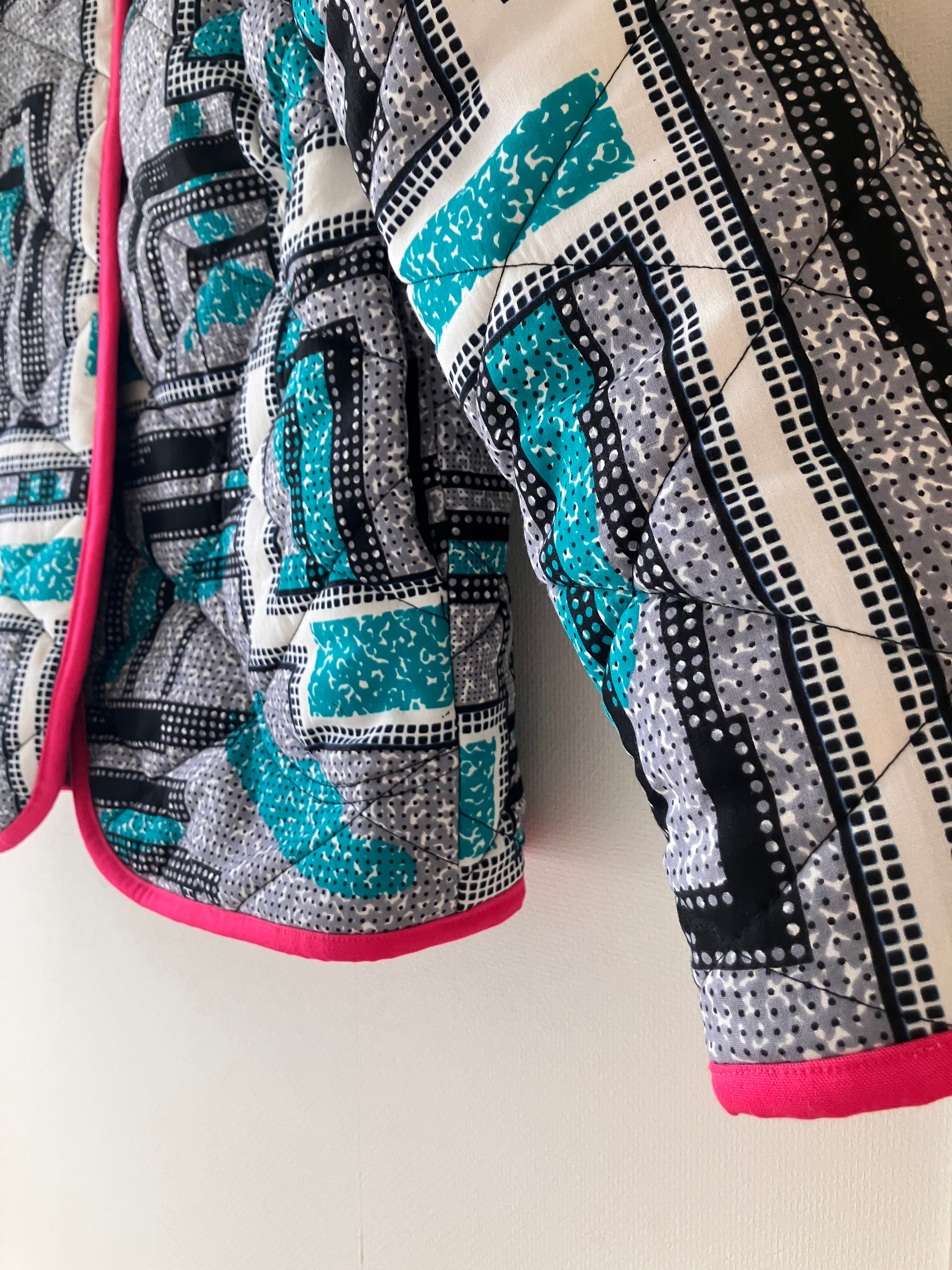 他のキルティング商品はふちまわりをカラフルな布でパイディングしましたが、こちらのブラウンのジャケットは唯一、ふちまわりをバイディングせずに作ったもの。