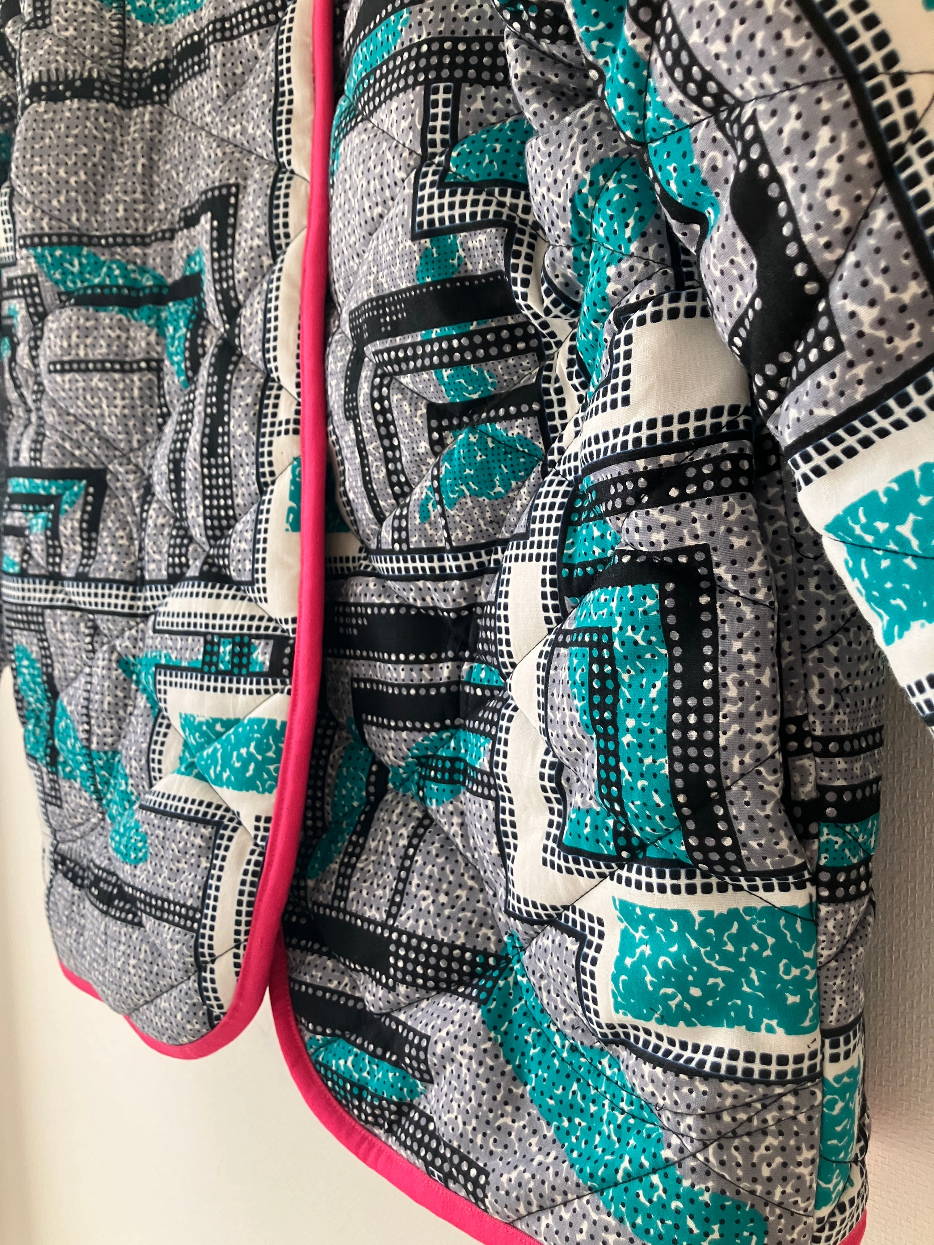裏地とアフリカ布の間にファイバーをはさみ、ななめにななめに丁寧にないあげました。