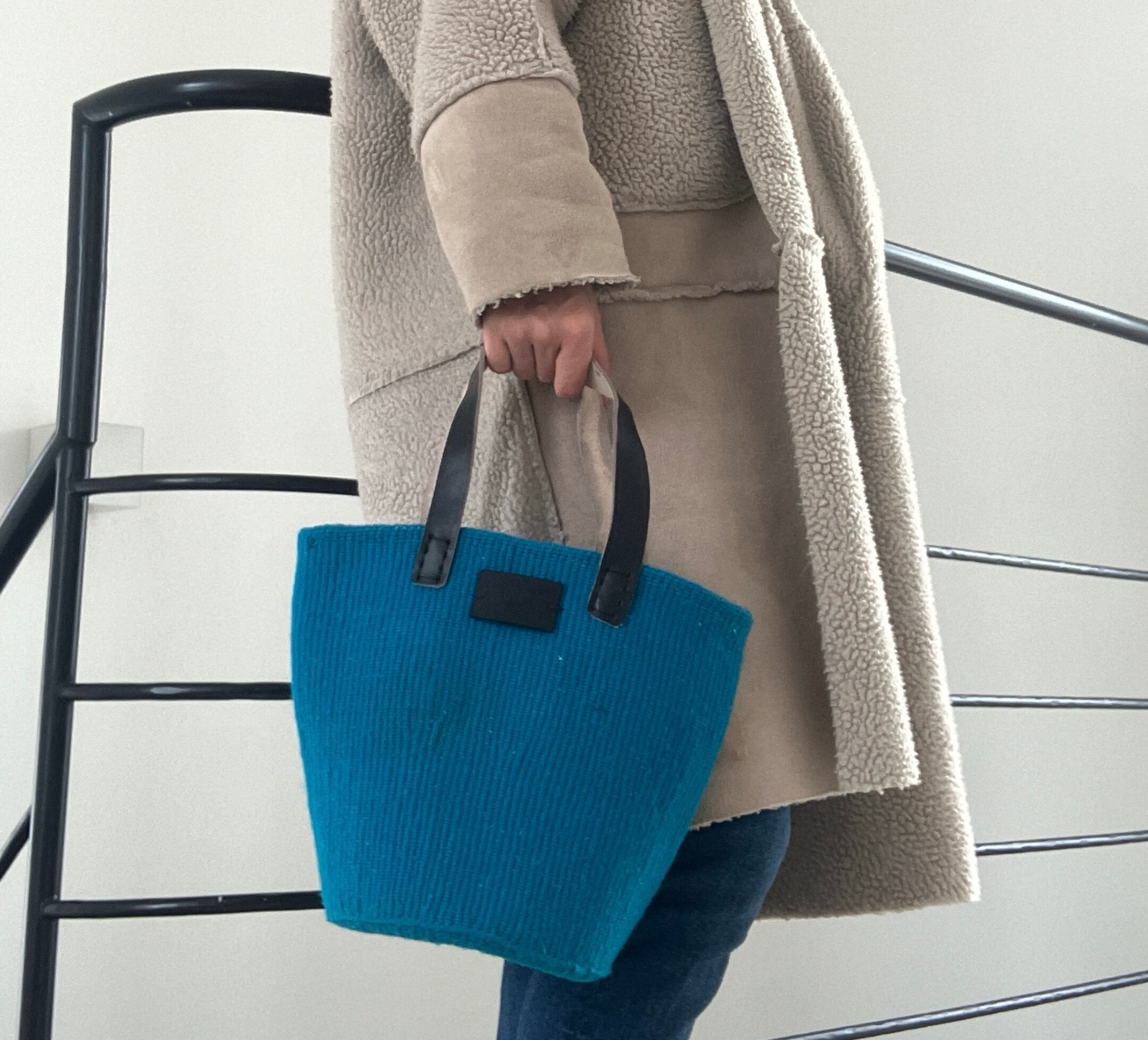 今回のこの色は、SIKUNJEMA代表自らがナイロビから1時間の毛糸専門工場へ出向き、日本人の肌の色に合う毛糸を購入してきました。持ち手は牛革をブラックに染めたもの。革商品全般的に水で濡らすと材質の劣化や色落ちの原因となりますので、水に濡らさないようにご注意ください。