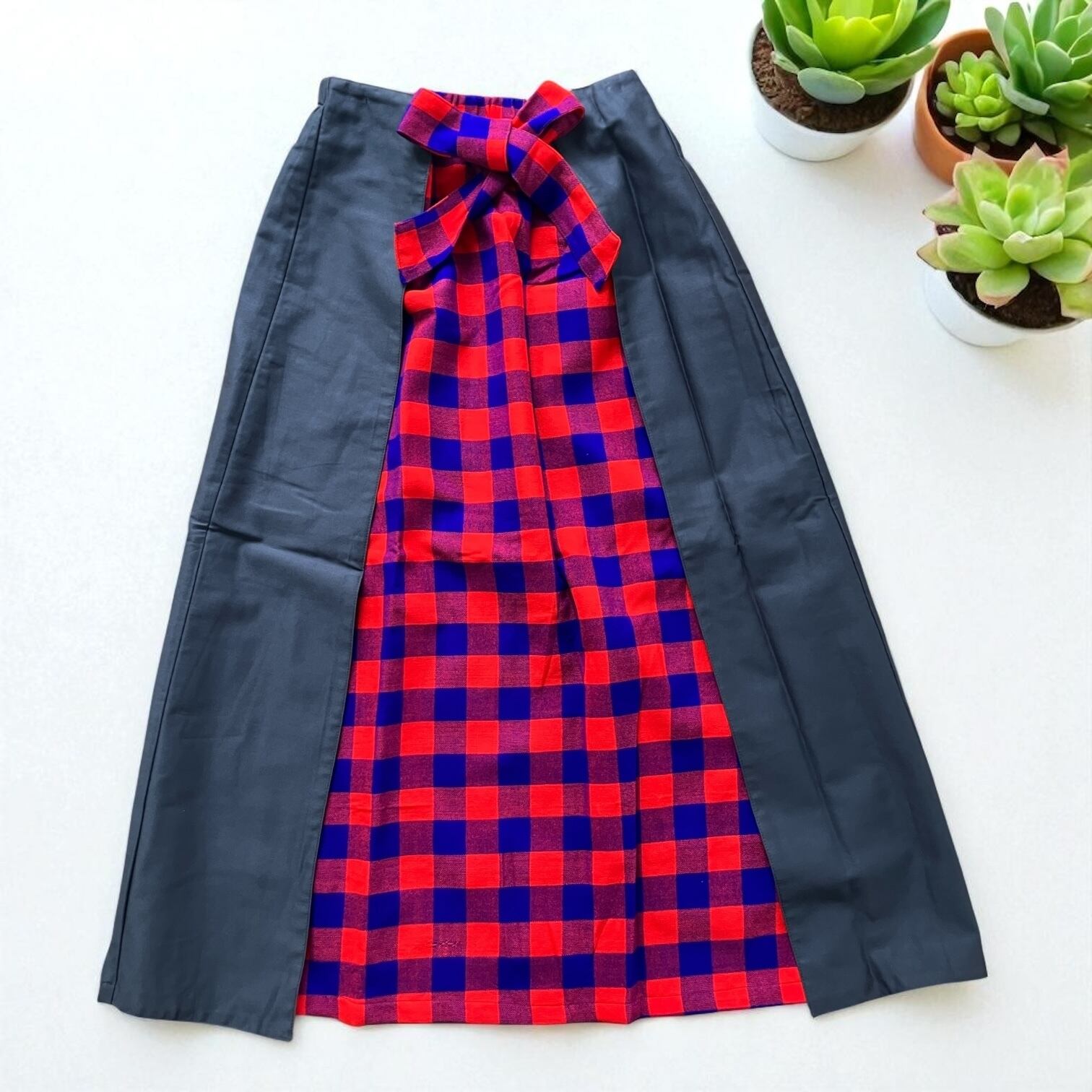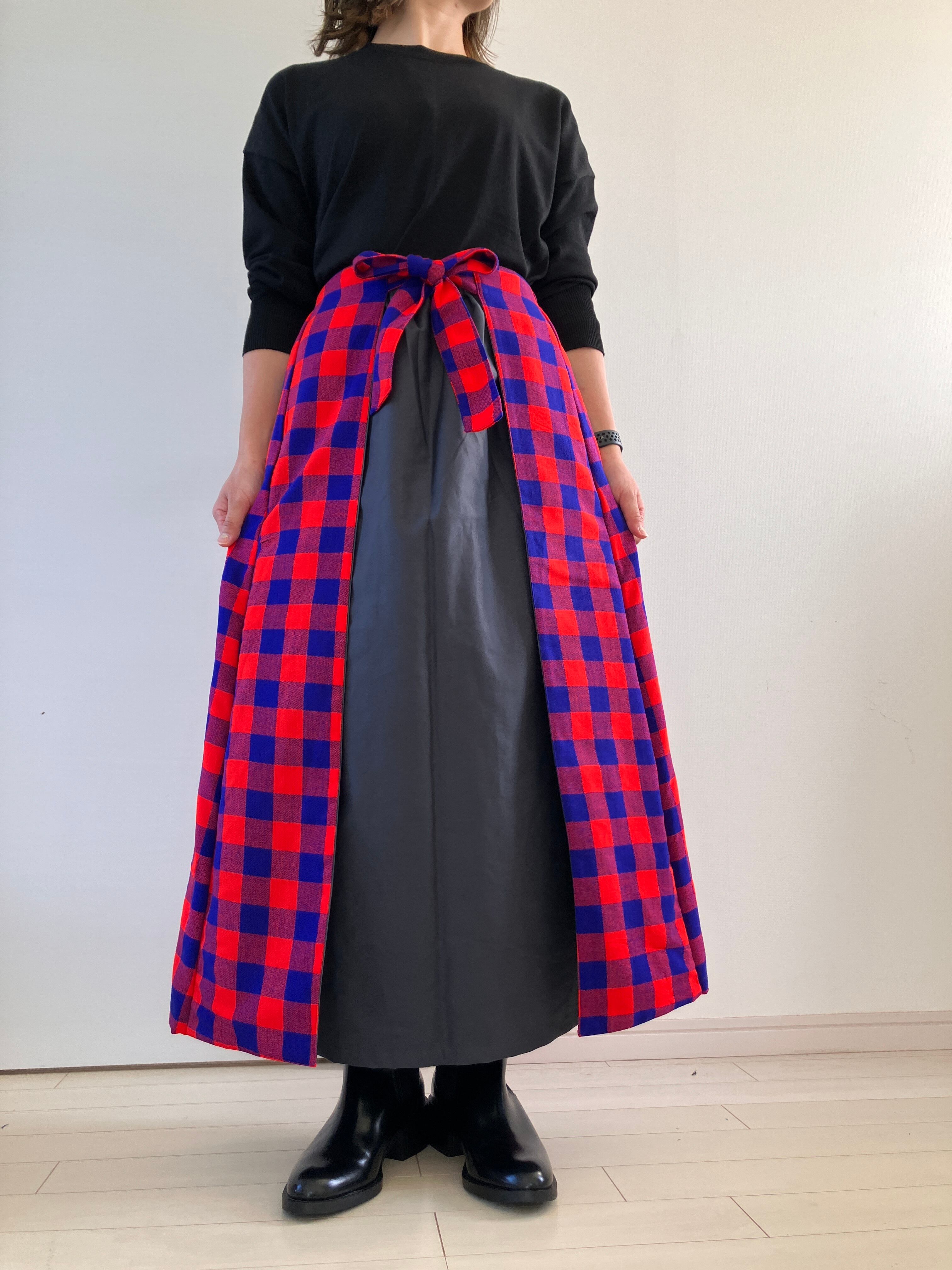 アフリカ布には珍しい、白と黒を基調としたモノクロのスカートたちでお作りしていたビリスカート。今回はそのビリスカートをかわいいチェックのマサイシュカで作りました。マサイシュカ部分はアクリルなのでとってもあったかいのです。静電気予防のインナーもつけました。