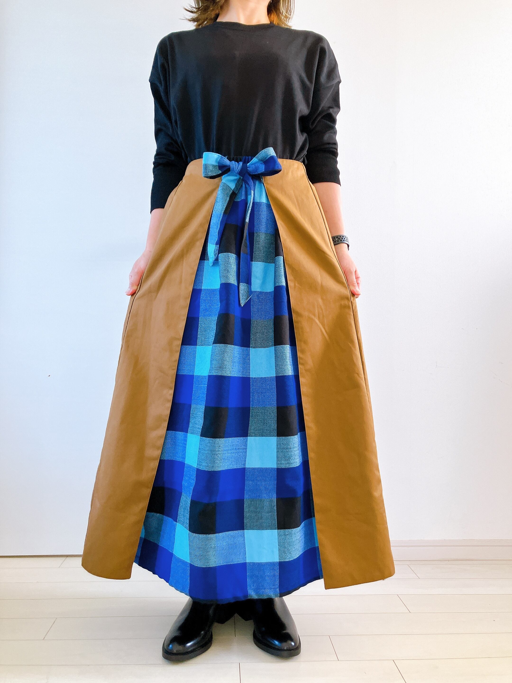 リバーシブルになっていて、単色の布を外にしても、マサイシュカを外にしてもどちらでもかわいいスカート。色をサイドにしたり、後ろにしたり、使い方次第で色々な顔を見せてくれるスカートです。