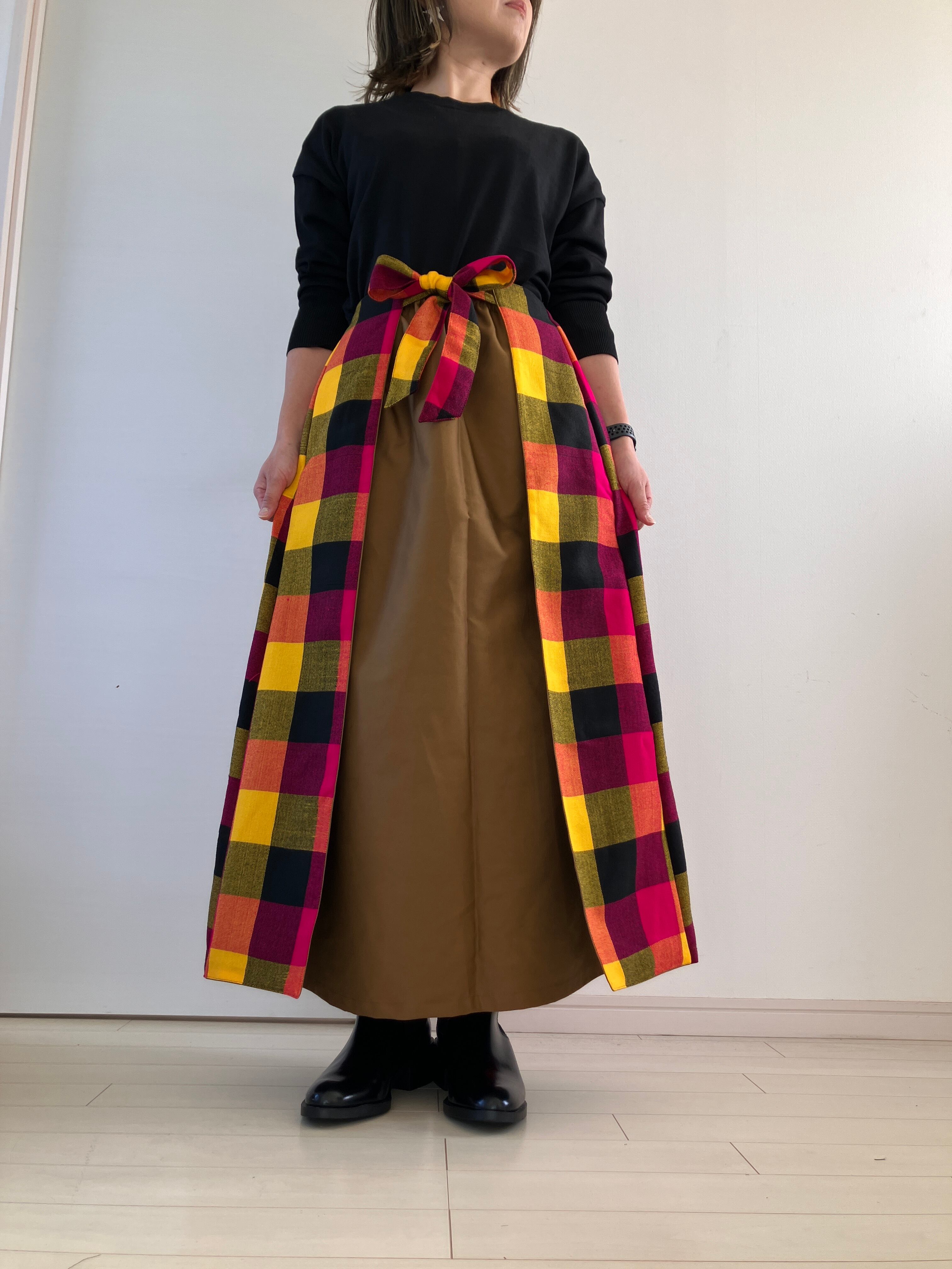 アフリカ布には珍しい、白と黒を基調としたモノクロのスカートたちでお作りしていたビリスカート。今回はそのビリスカートをかわいいチェックのマサイシュカで作りました。マサイシュカ部分はアクリルなのでとってもあったかいのです。静電気予防のインナーもつけました。
