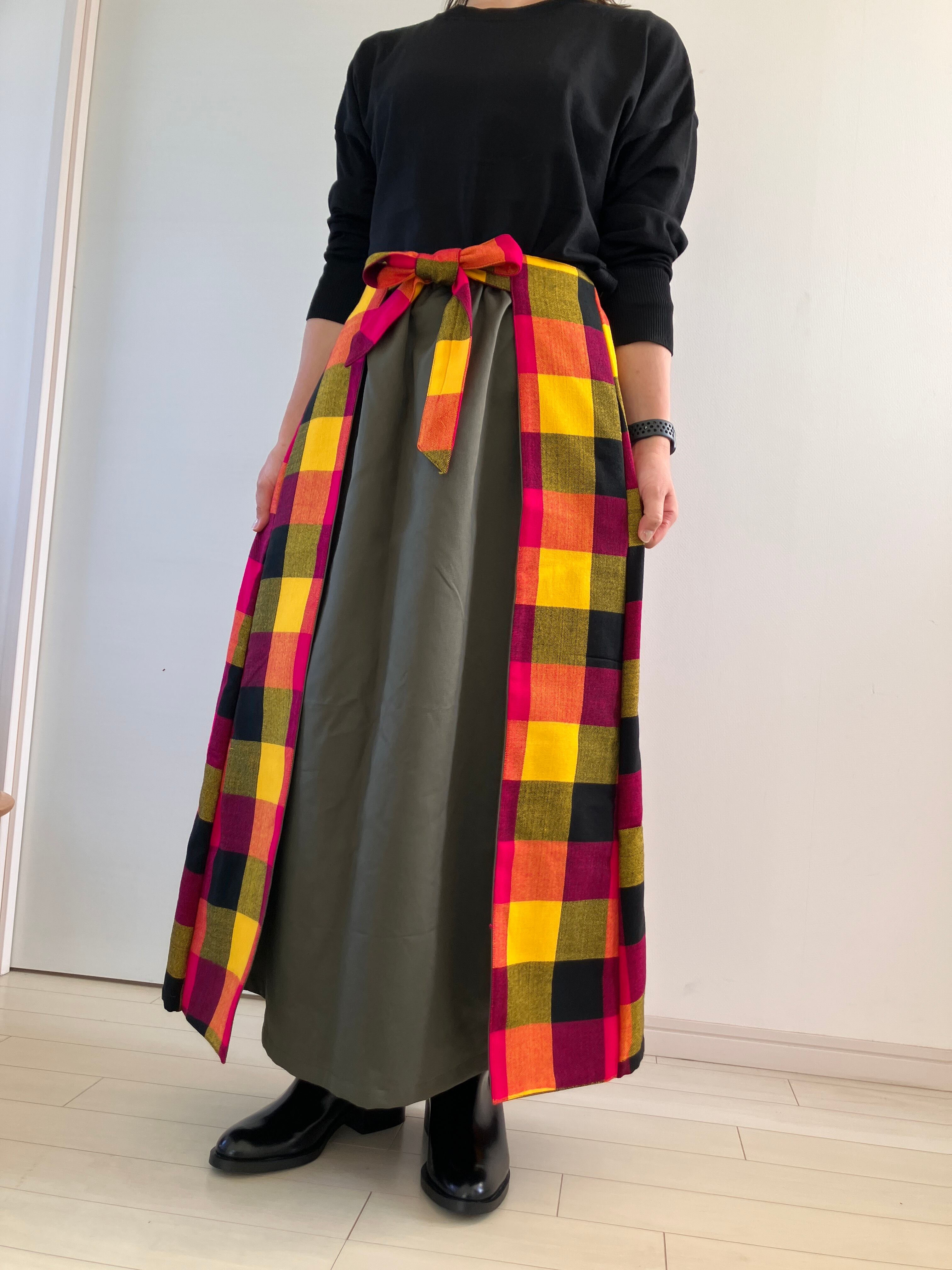 リバーシブルになっていて、単色の布を外にしても、マサイシュカを外にしてもどちらでもかわいいスカート。色をサイドにしたり、後ろにしたり、使い方次第で色々な顔を見せてくれるスカートです。