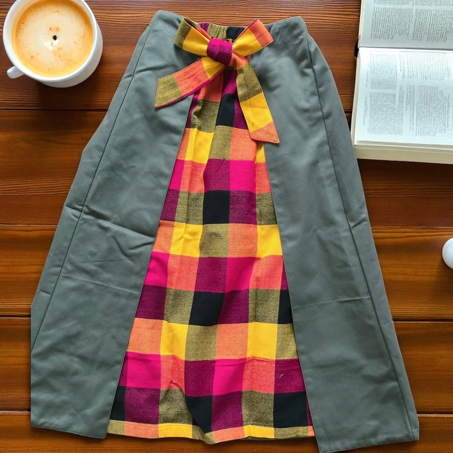 リバーシブルになっていて、単色の布を外にしても、マサイシュカを外にしてもどちらでもかわいいスカート。色をサイドにしたり、後ろにしたり、使い方次第で色々な顔を見せてくれるスカートです。