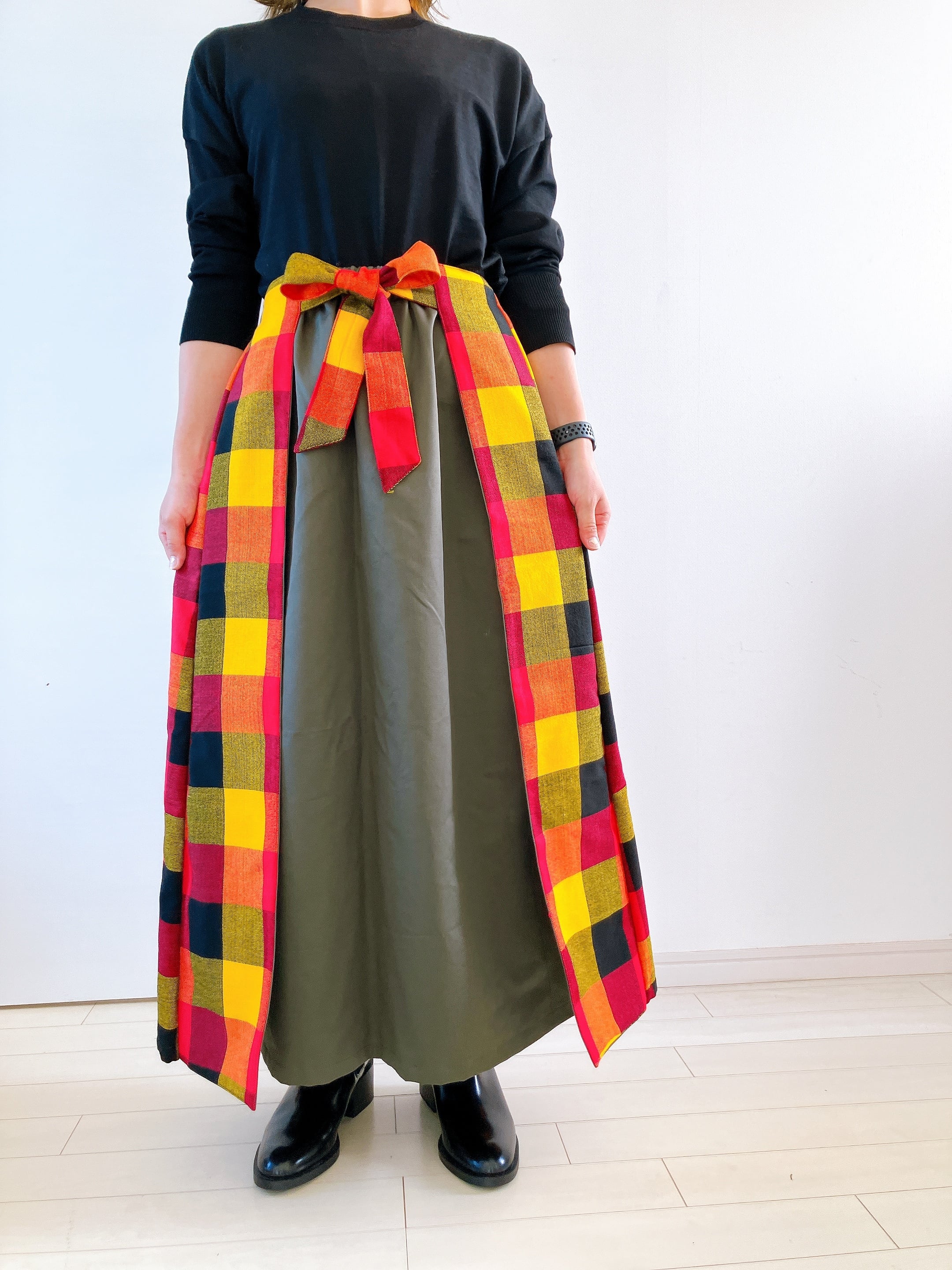 アフリカ布には珍しい、白と黒を基調としたモノクロのスカートたちでお作りしていたビリスカート。今回はそのビリスカートをかわいいチェックのマサイシュカで作りました。マサイシュカ部分はアクリルなのでとってもあったかいのです。静電気予防のインナーもつけました。