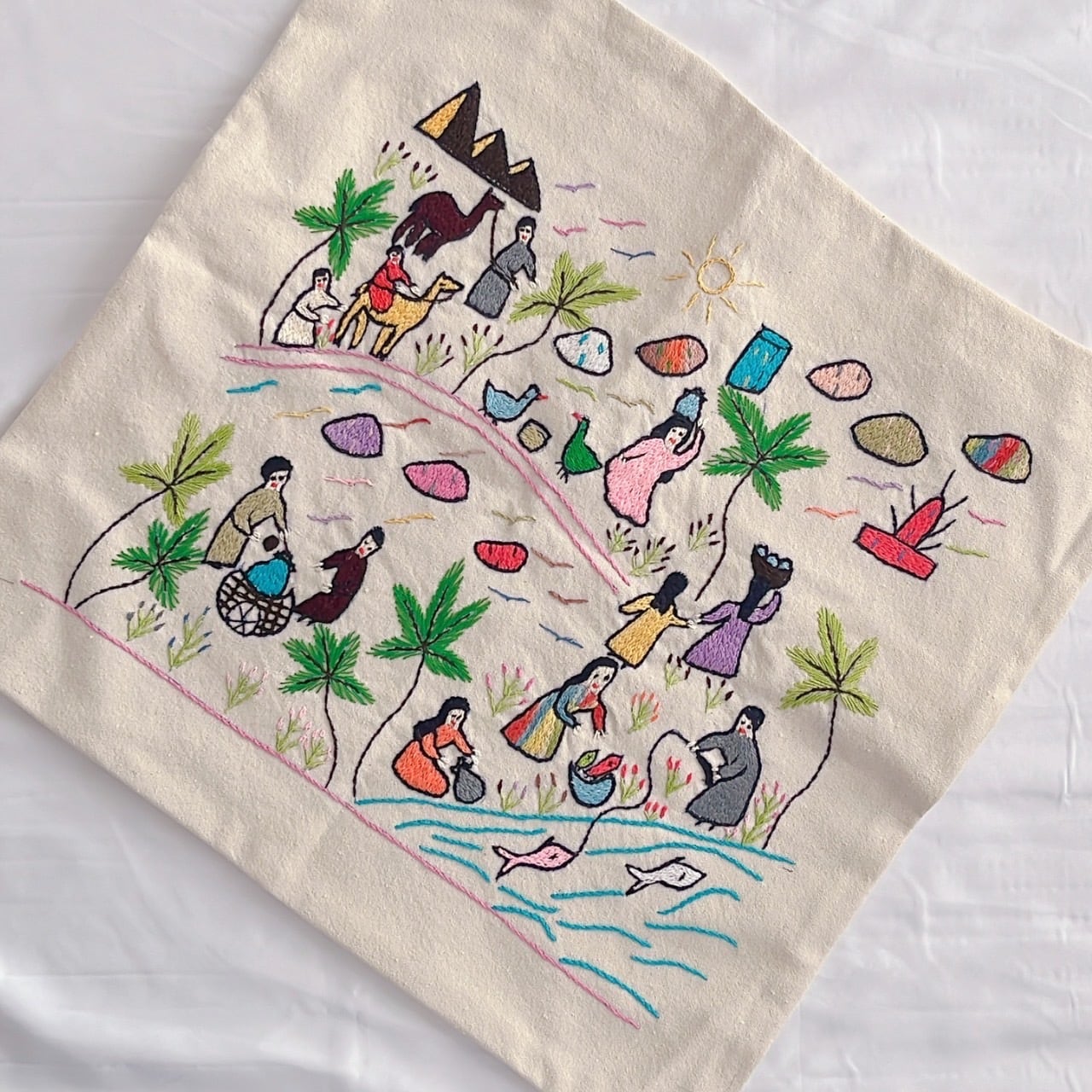 エジプトのシングルマザーが作った、ちょっとシュールなゆる刺繍クッションカバー。