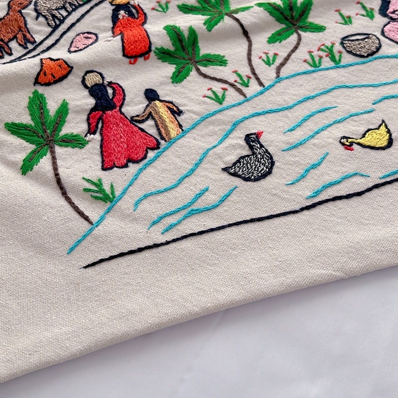 なんと隙間なく、全面いっぱいに刺繍を施し、イスラム教を思わせる素敵な文化紹介模様となっています。細かいところまでよく再現されていて、見ていて飽きない、クスッと笑える世界に一つの刺繍クッションカバーです。
